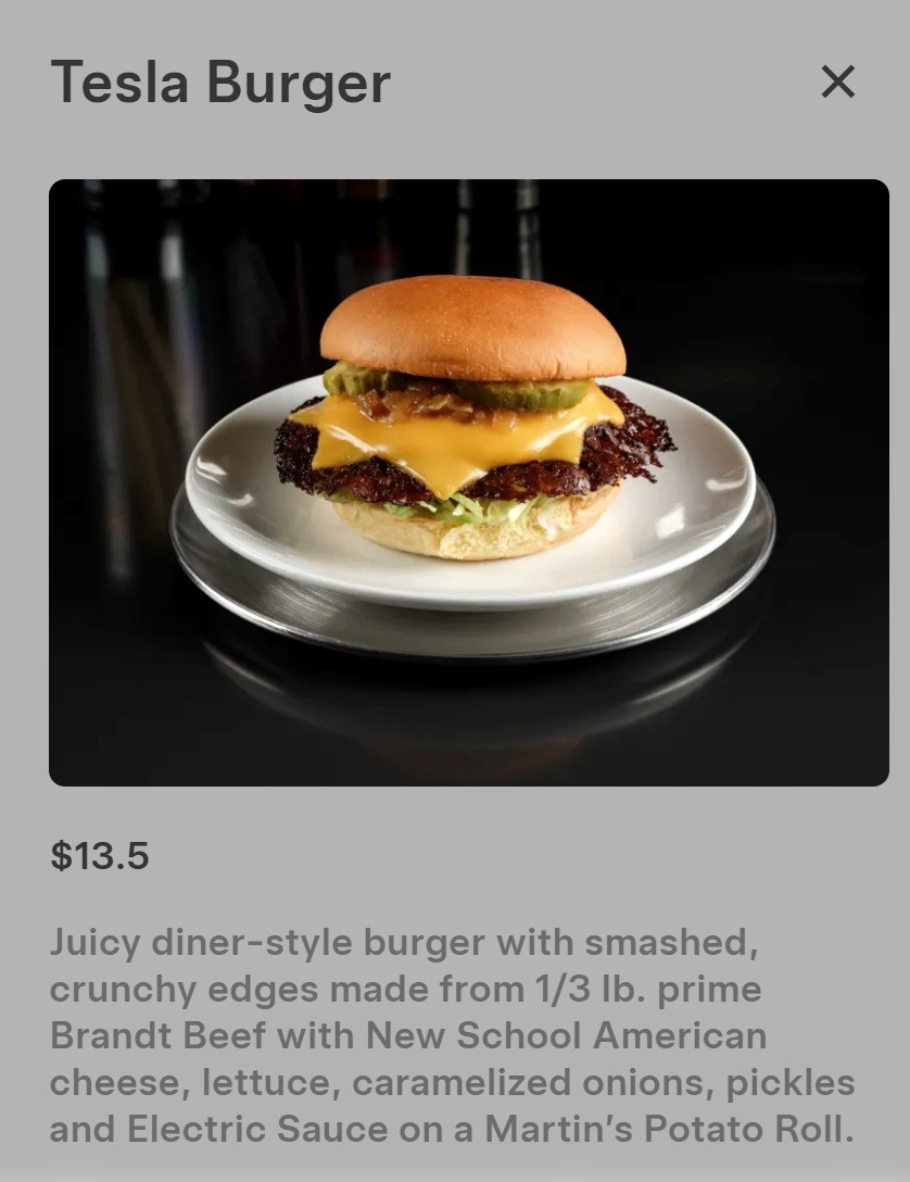 테슬라버거부터 핫도그, 샐러드, 애플파이, 와플 그외 커피나 기타 음료도 구성되어 있죠. 그리고 이 메뉴를 감싸는 패키지?는 테슬라의 사이버트럭 형태이기도 합니다.