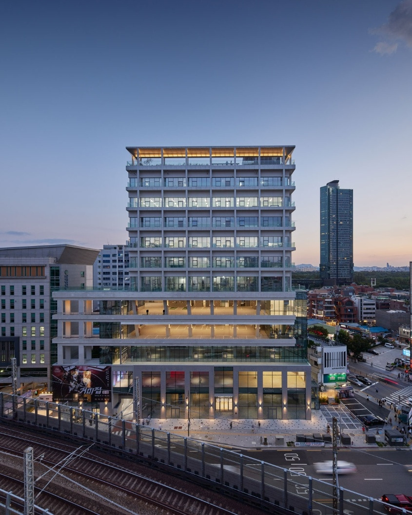 주차장은 용적률에 포함되지 않다보니, 건물의 용적률을 다 채우고 높이에 여유가 있다면, 이렇게 중앙에 주차장을 넣어 활용할 수 있는 거죠. 또한 주차장을 지하에 덜 넣게 되면, 지하를 파는 공사비를 줄일 수 있으니 1석2조이기도 하죠. 더군다나 맞은편에 성수 지상철이 지나가서 간섭이 되는 부분에 오피스를 위치시키는 것보다 효율성을 증가시킬 수도 있고요.