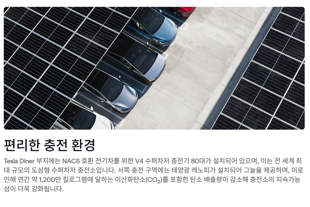 어떻게 보면 단순히 자동차 주유소라고 생각할 수도 있지만, 테슬라라는 브랜드의 전기차 충전소이자 그 브랜드의 결을 함께 가져가는 레스토랑 및 엔터테인먼트 관람을 위한 복합문화공간이라는 점이 많은 사람들에게 관심을 끌 수 있었던 이유 같습니다.