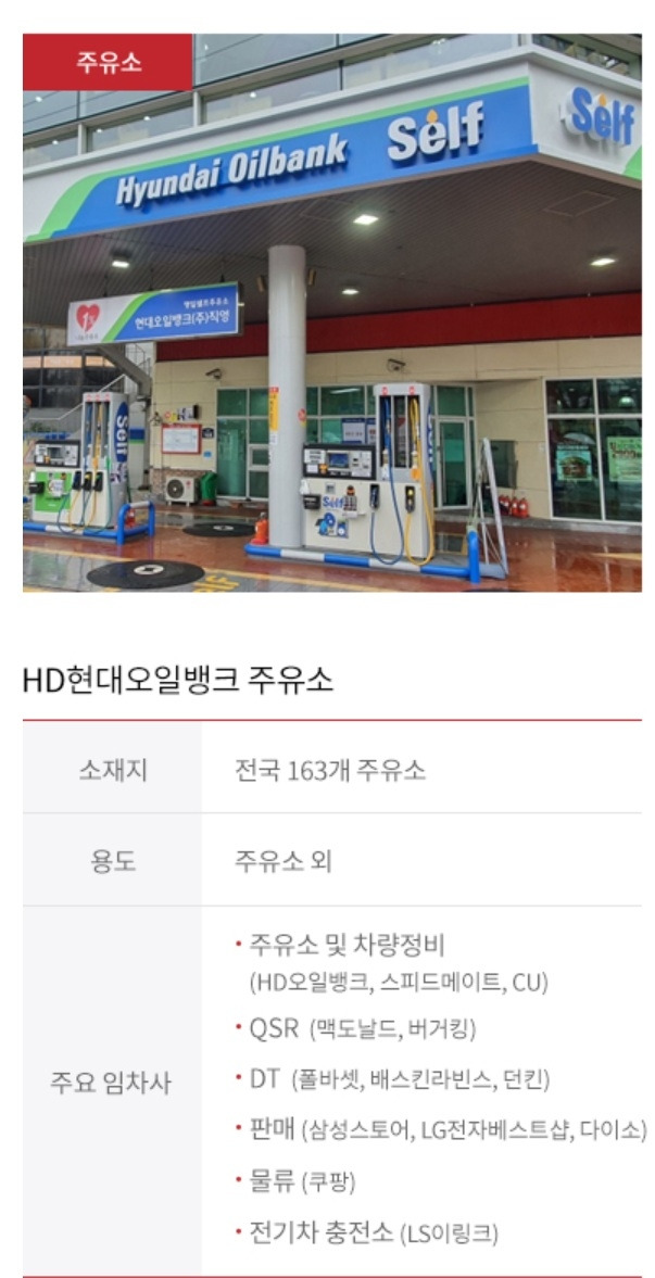 대표적으로 코람코자산신탁이 코람코라이프인프라리츠를 운영하며 주차장을 리츠에 편입시키기도 합니다. 과거 주차장으로 사용되던 곳을 F&B나 세차장 등으로 개발하고 있기도 하죠. 홈페이지에 따르면 전국 160여개 주유소 현대오일뱅크가 본 리츠에 포함되어 있다고 하네요. 물론 다른 인프라 물류센터도 포함되어 있긴 합니다.