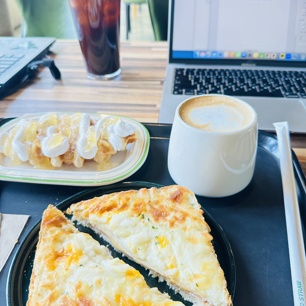 크로폴과 토스트를 주문했다. 언제나 그렇듯 나는 카페라테로.