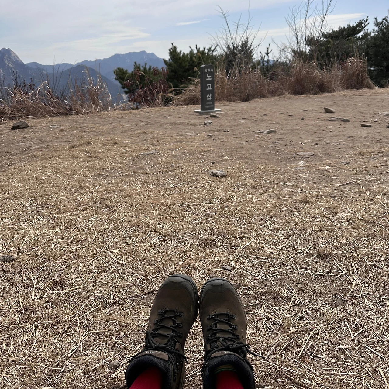 노고산 정상석과 열심히 걸어온 발을 같이 찍었다.