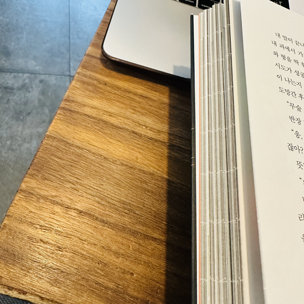 책을 모두 읽고 나서 책배를 보니 그 이미지가 여느 책들과 달랐다. 예전에 책을 직접 엮은 체험을 한 적이 있었는데 종이와 종이 사이를 뚫어 실로 묶고 풀칠을 했다. 쉽지 않은 수제 책 만들기였지만 다 만들었을 때 세상에 단 한 권이라는 생각에 또 소중히 잘 보관하고 있다. 그 모양을 이 책에서 만나다니. :)
