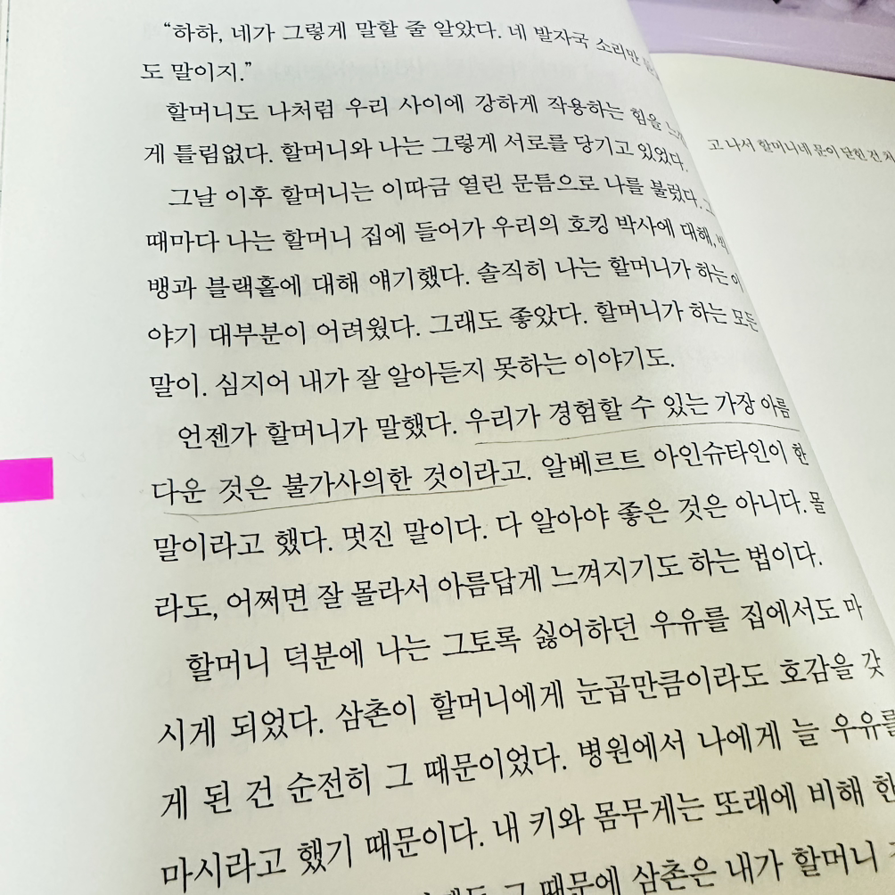 할머니와 공통분모인 스티븐 호킹의 일화는 과학에 대해 전혀 모르는 내게도 흥미로웠다. 갈릴레오 갈릴레이의 사망 후 300년 되는 날 태어난 호킹박사의 고통에 대해 지수 역시 느끼게 된다.