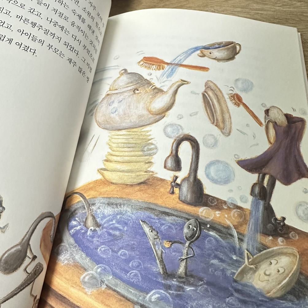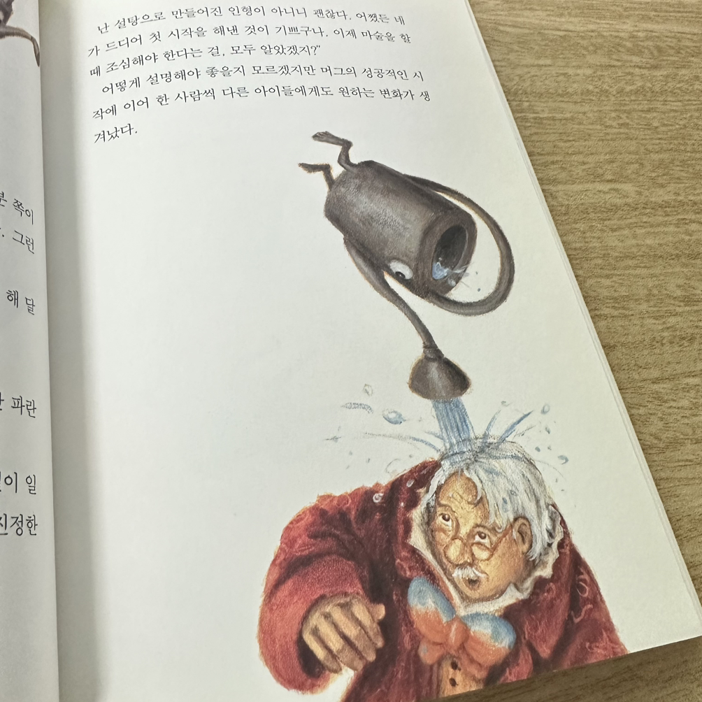 질버 선생님이 마법을 부리면서 화분이 아는 선생님의 머리 위로 물이 뿌려지자 머그는 자신이 그렇게 빌지 않았다고 해 교실에서 웃음이 터졌다. 이때 선생님은 자신이 '설탕으로 만들어진 인형'이 아니니 괜찮다고 한다. 나는 이 문장이 참 예쁘단 생각을 했다. 선생님이 미안해하는 아이에게 전할 수 있는 따뜻한 말 한마디였다.