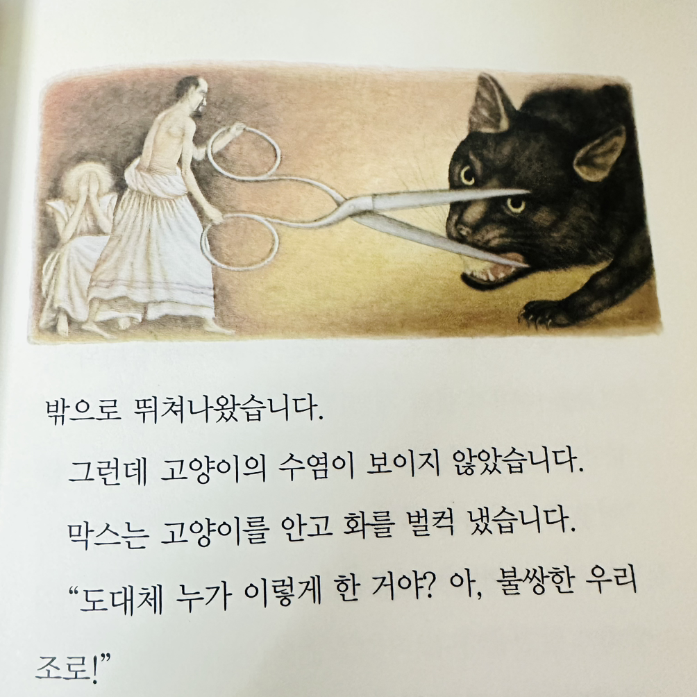 단순히 몸만 변하는 것이라면 큰 갈등이 없어 밋밋할 수 있지만, 위기가 닥친다. 바로 렝켄의 남자친구 막스가 고양이 조로를 데리고 온 것이다. 보통 이야기라면 고양이가 엄마, 아빠를 쫓아다니거나 할 텐데 이 이야기는 사뭇 다르다. 난쟁이들은 조로의 수염을 가위로 잘라버리고 놀란 고양이와 막스는 집으로 돌아간다.