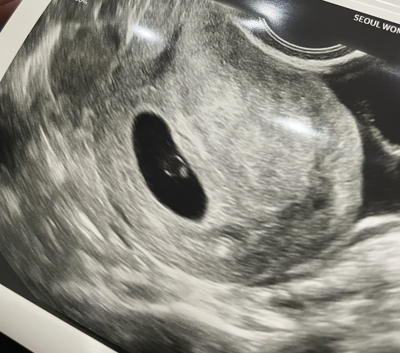 잔뜩 긴장하고 누웠는데, 초음파 화면 속 아기집과