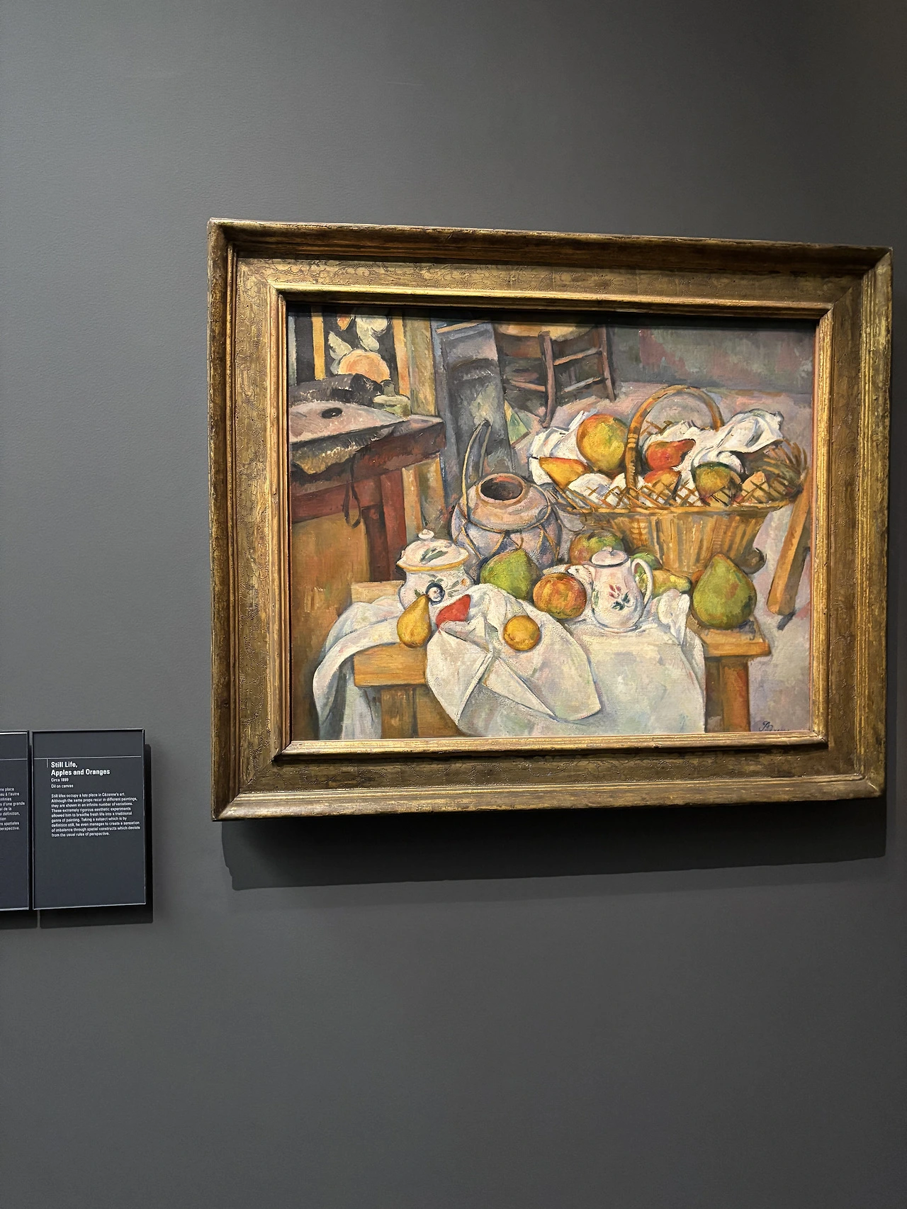 왼쪽 그림을 보시면 과일 바구니가 있고, 그 아래로 여러 과일들이 엉켜 있는 모습이 보입니다. 동그란 주전자와 커다란 책상의 배치가 이상해 보이지 않으시나요? 동그란 주전자가 더 '위에서 아래로' 봐야할 것 같은 각도인데, 책상은 상대적으로 평평합니다. 그와중에 뒤의 과일 바구니는 아예 평평한 높낮이로 설정되어 있고, 맨 뒤에 의자는 마치 공중에 떠있는 듯 심하게 위로 올라가 있죠.