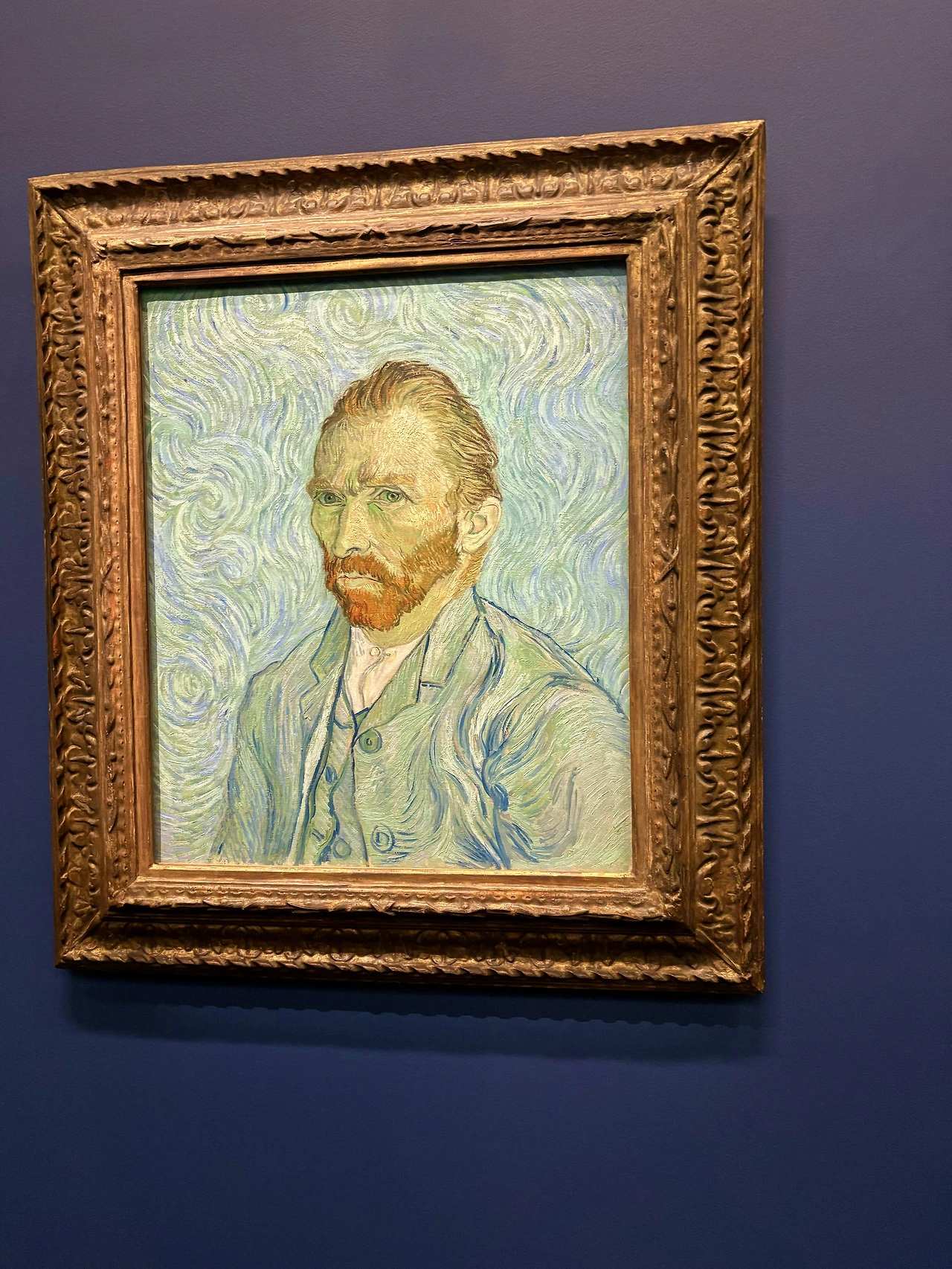 하지만 고흐는 여기에서 좀 더 나아가, 자신의 감정을 색에 투영합니다. 그는 작품에 푸른색과 노란색을 주로 사용합니다. 실제로 푸르거나 파랗지 않은 부분에도 말이죠. 이 작품에서도 고흐는 배경을 노란색과 파란색이 섞인 아지랑이 물결로 채웁니다. 그의 작품에서 자주 보이는 요소인데요, 제 눈에는 저 소용돌이가 마치 혼란스러움, 멜랑콜리처럼 보입니다. 이런 면에서 고흐의 그림이 참 매력적이라고 생각했습니다.