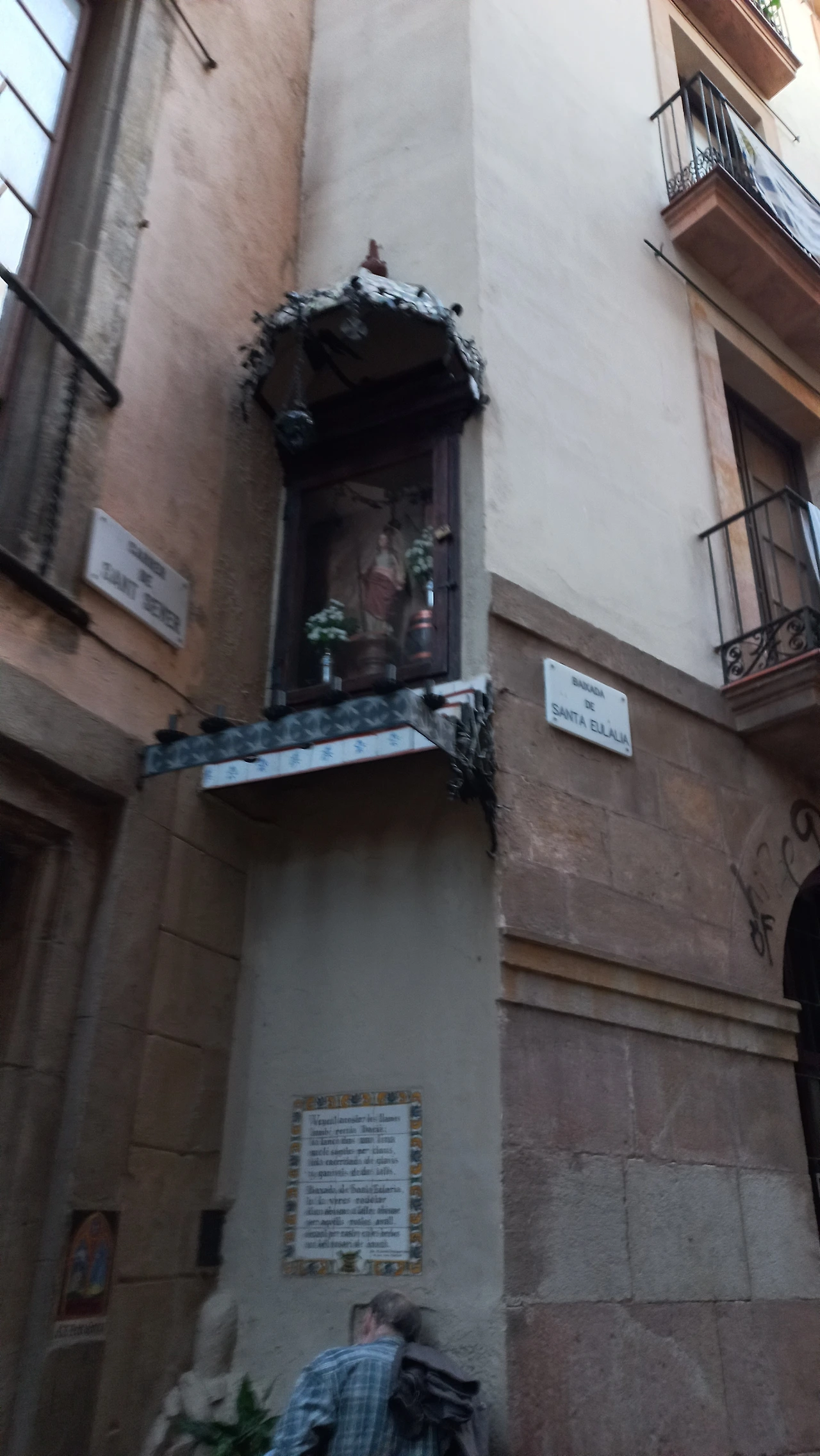 1936년 스페인 내전 당시에 독재자 프랑코의 명령으로 벽에 사람들을 일렬로 세워놓고 총을 쏘았다는 곳이다. 가우디는 이 성당에 오는 길에 전차에 치여 숨졌댜. 전차에 치여 피를 흘리는 가우디를 시민들은 알아보지 못했다. 가우디가 노숙자 모습이었기 때문이다. 아무도 병원으로 데려가지 않았다. 피가 묻을까봐 택시를 태우려고 하지도 않았다. 가까스로 병원에 옮겨졌으나 상태가 심각하여 사망했다. 1926년 7월 10일 가우디 나이 73세였다. 그의 유해는 내일 가게 될 사그리다 파밀리아 (성 가족 성당) 안에 묻혀 있다고 한다.