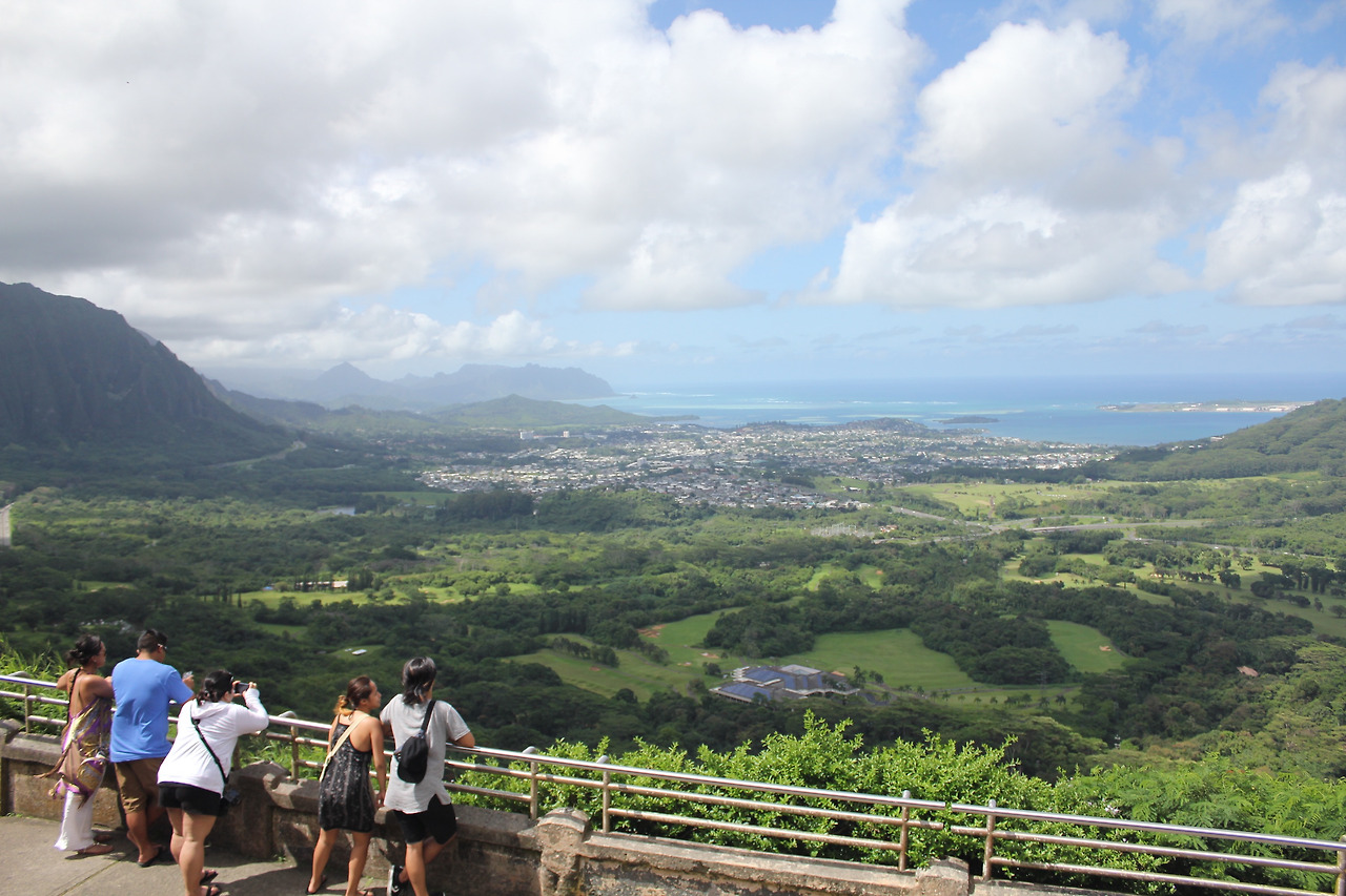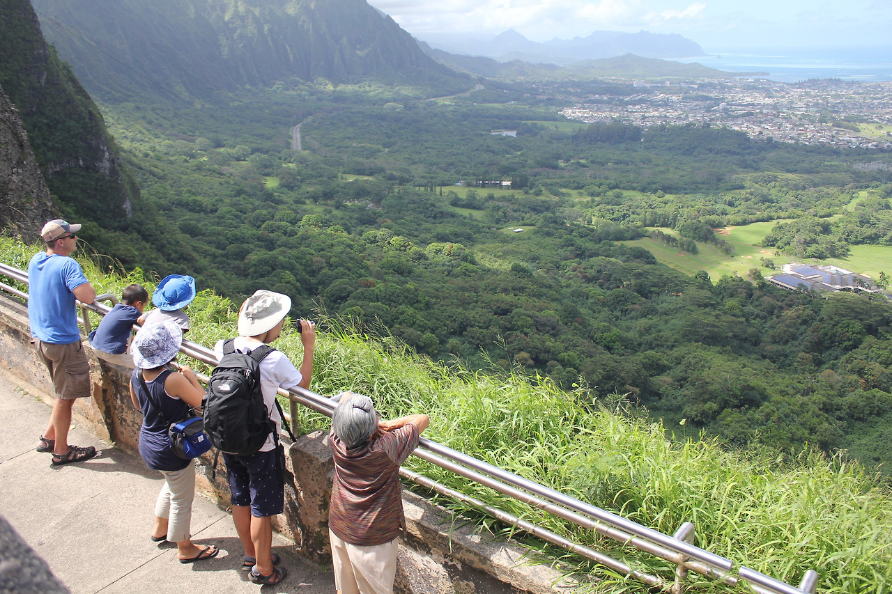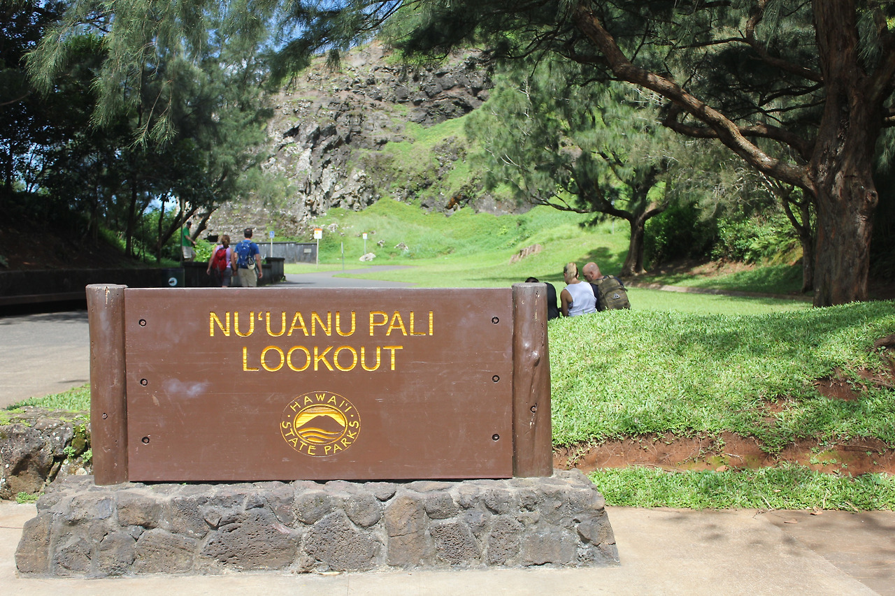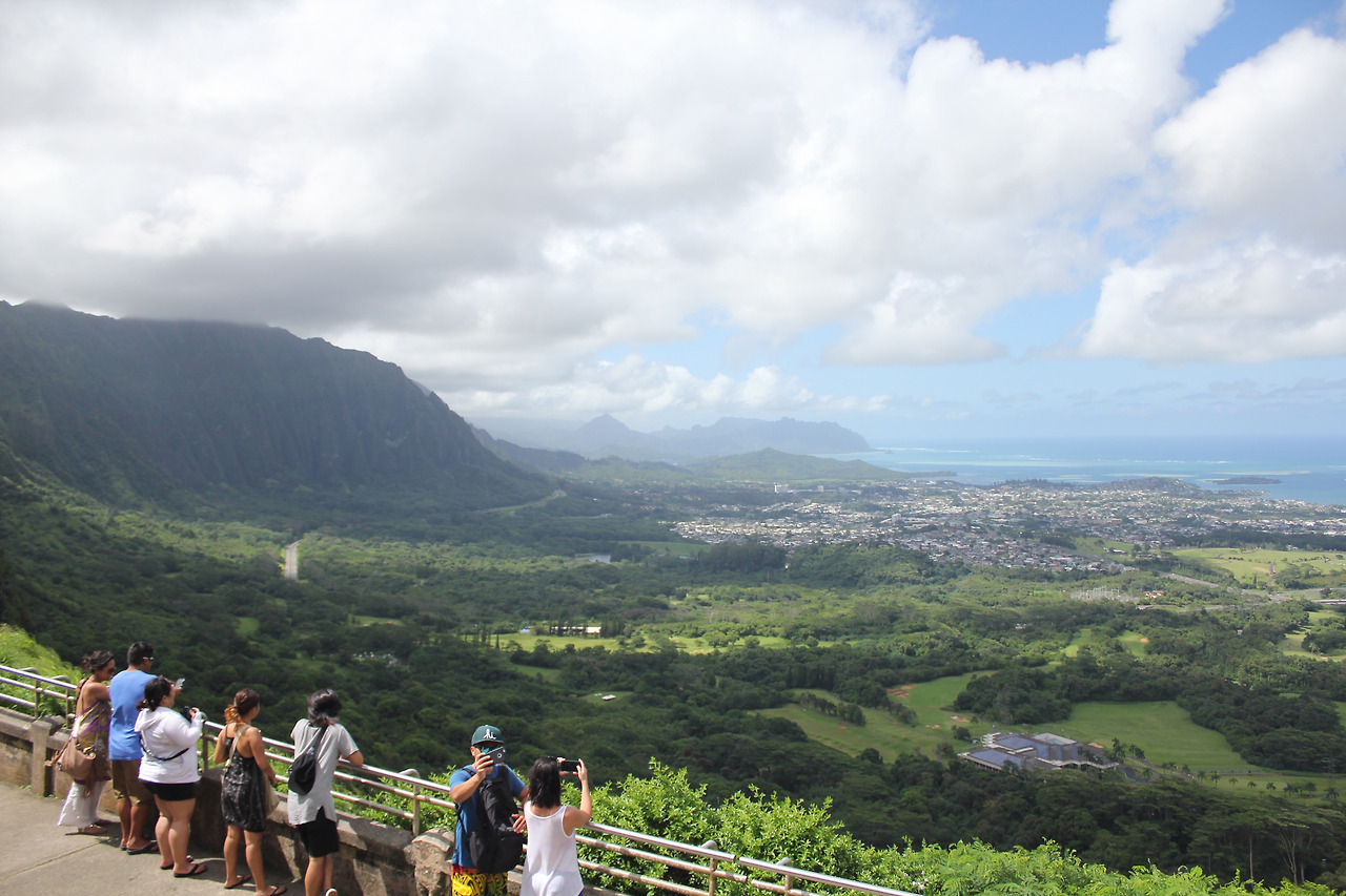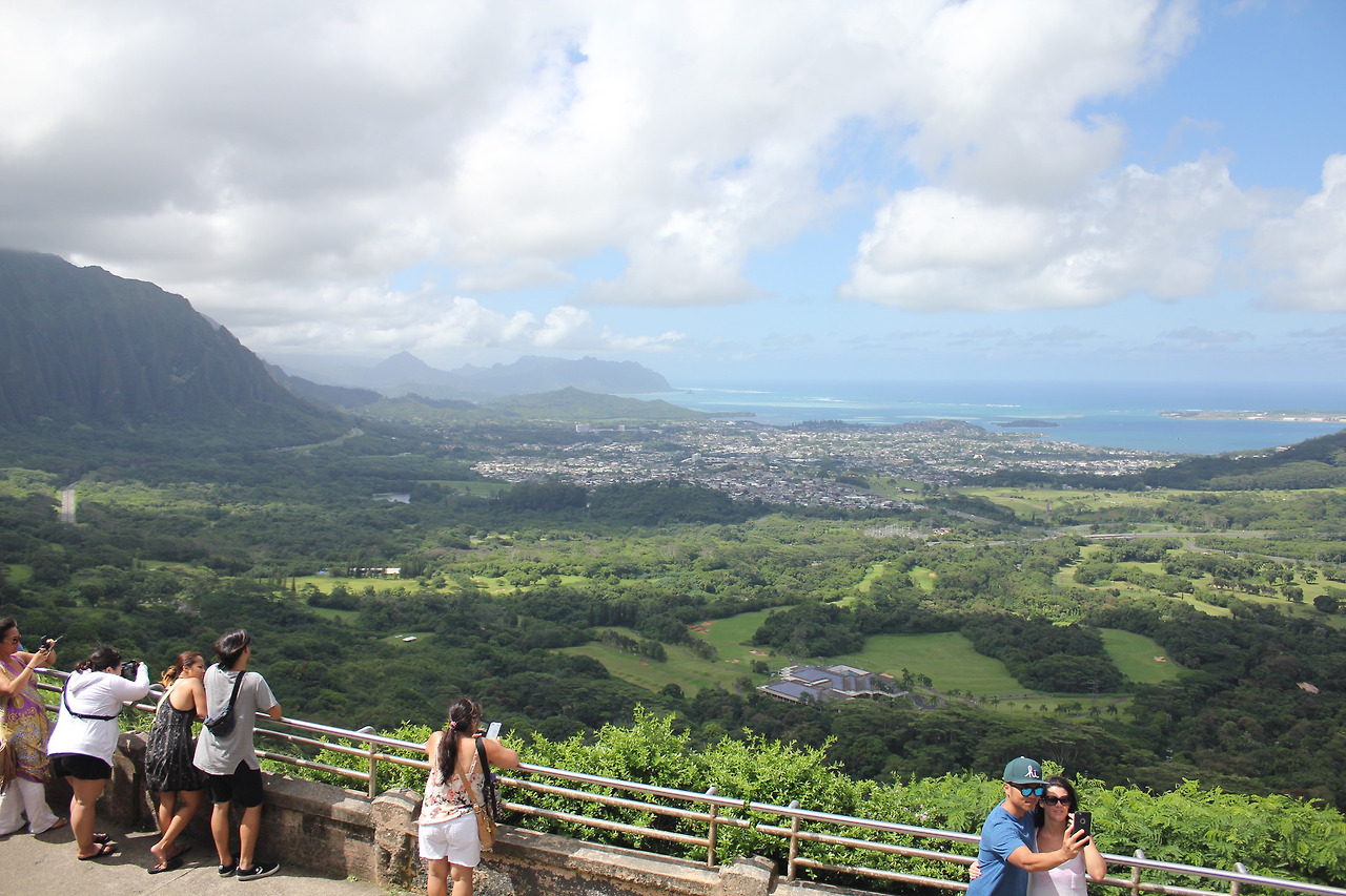 NU'UANU PALI LOOKOUT. 바람산이라 불리는 곳이다. 주차를 하고, 저만치 사람들이 옹기종기 모여 있는 전망대에 다다르면, 거짓말 같은 광경이 눈 앞에 펼쳐진다.