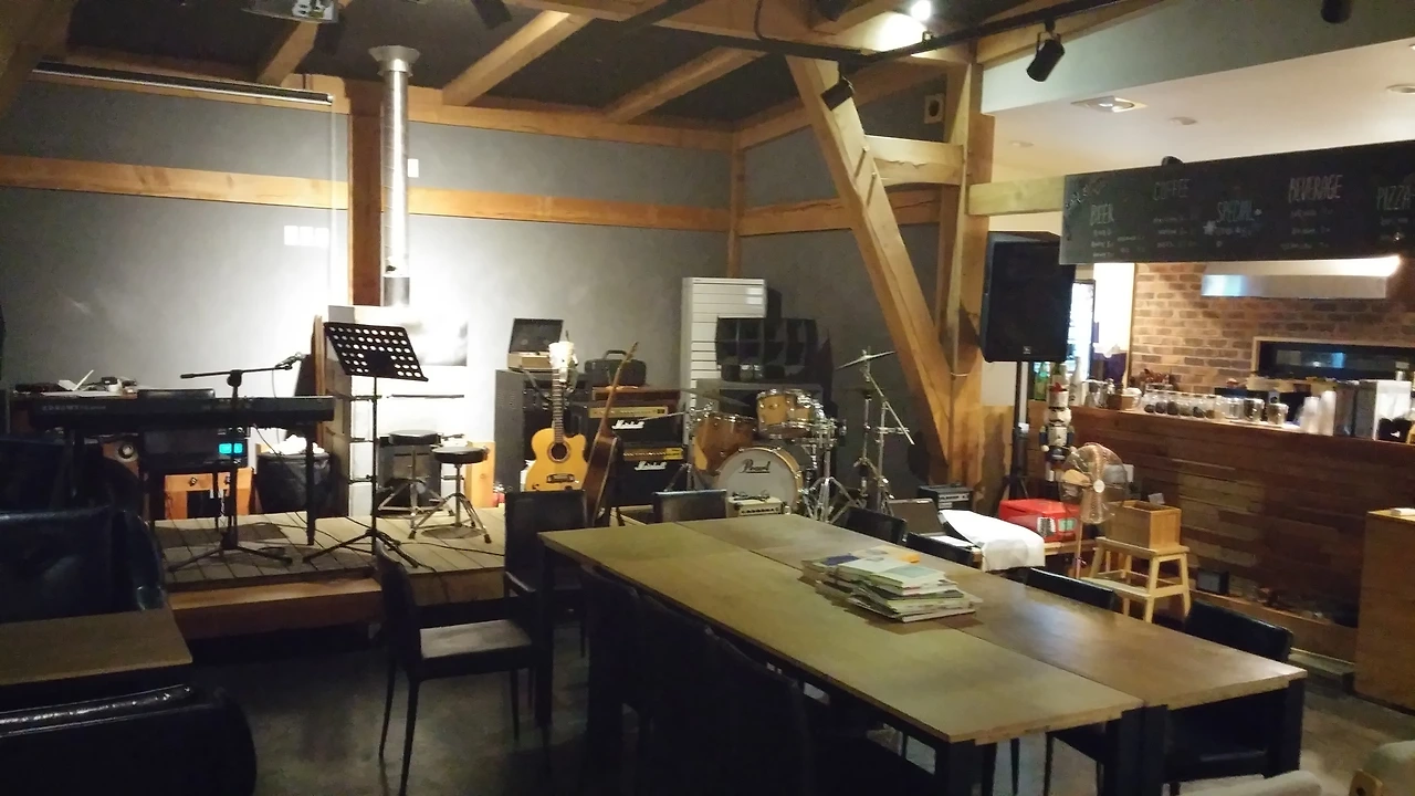 공연을 할 수 있는 무대가 있는데 마샬 기타앰프에 커즈와일 신디사이저, 통기타들이 보인다.