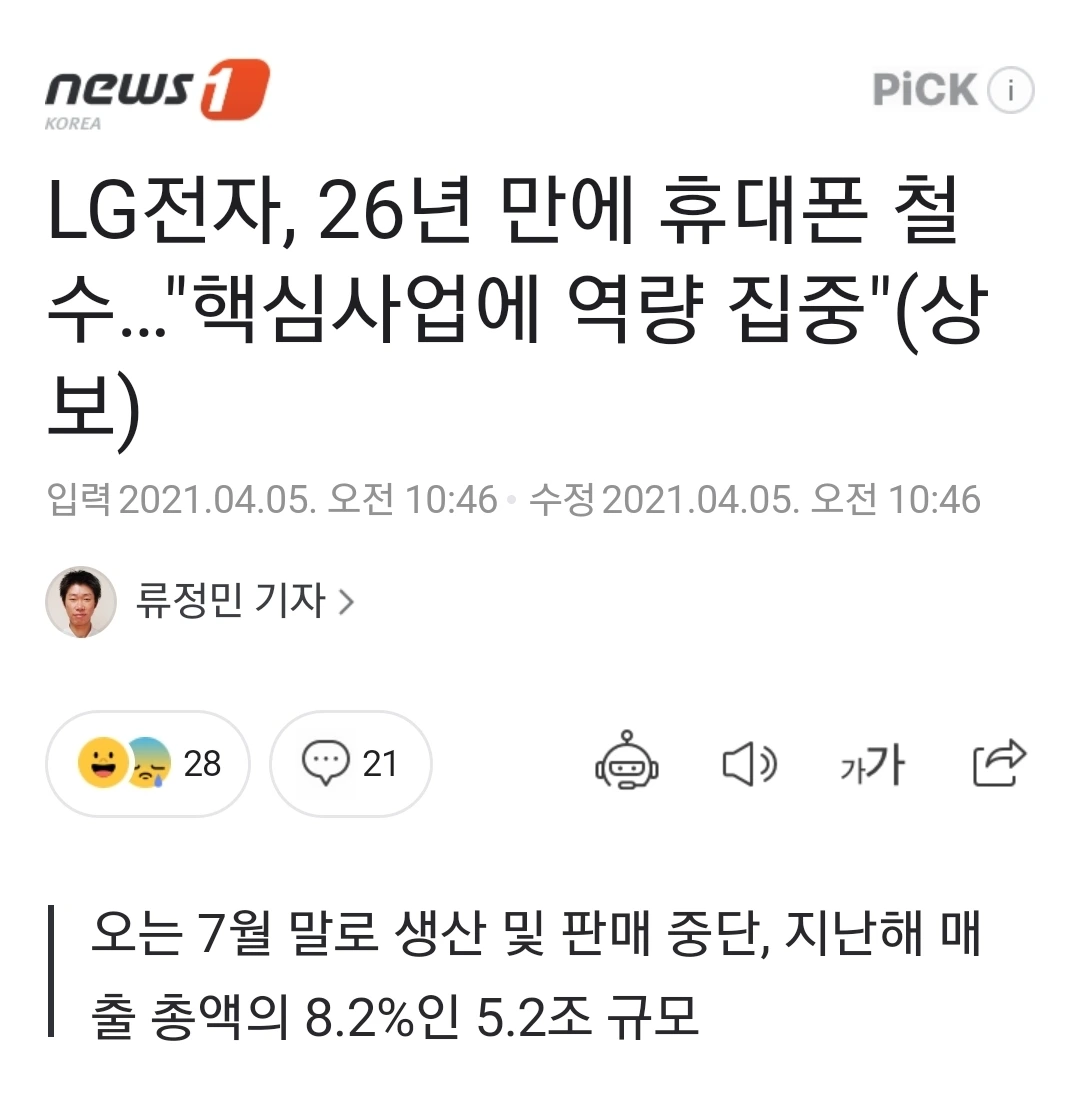 월요일, 엘지전자가 26년만에 휴대폰 사업을 철수했습니다. 휴대폰이 대중화되기 전인 벽돌폰 시절부터 하던 사업인데 접는다니 왠지 제가 다 섭섭합니다.