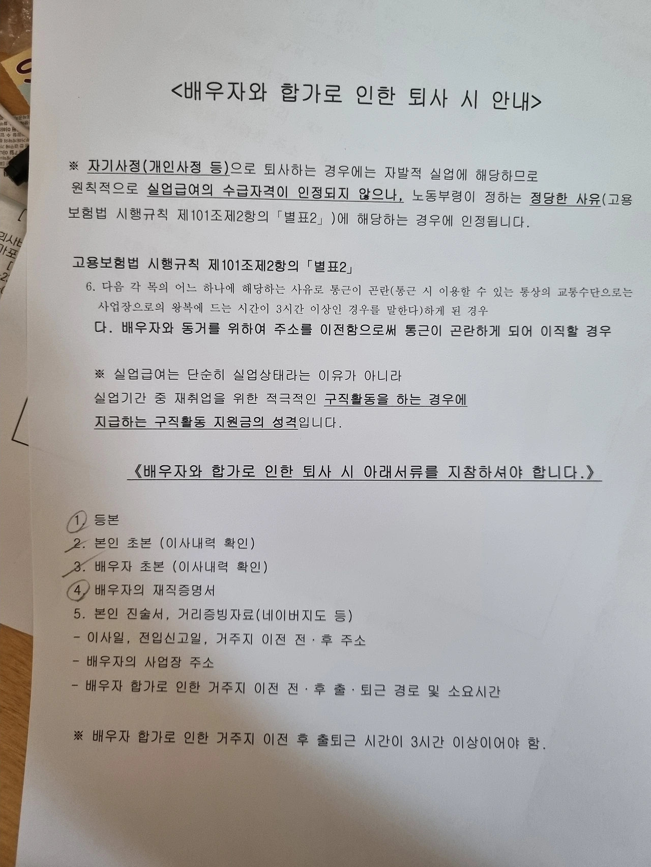 실업급여(=구직급여)는 사실 '자발적 퇴직'인 경우에는 받을 수가 없어요. 하지만 자발적 퇴직이어도 실업급여를 받을 수 있는 몇 가지 예외사항이 있는데 그 중에 하나가 바로 '배우자, 직계존속과의 동거를 위한 거주자 이전'입니다.
