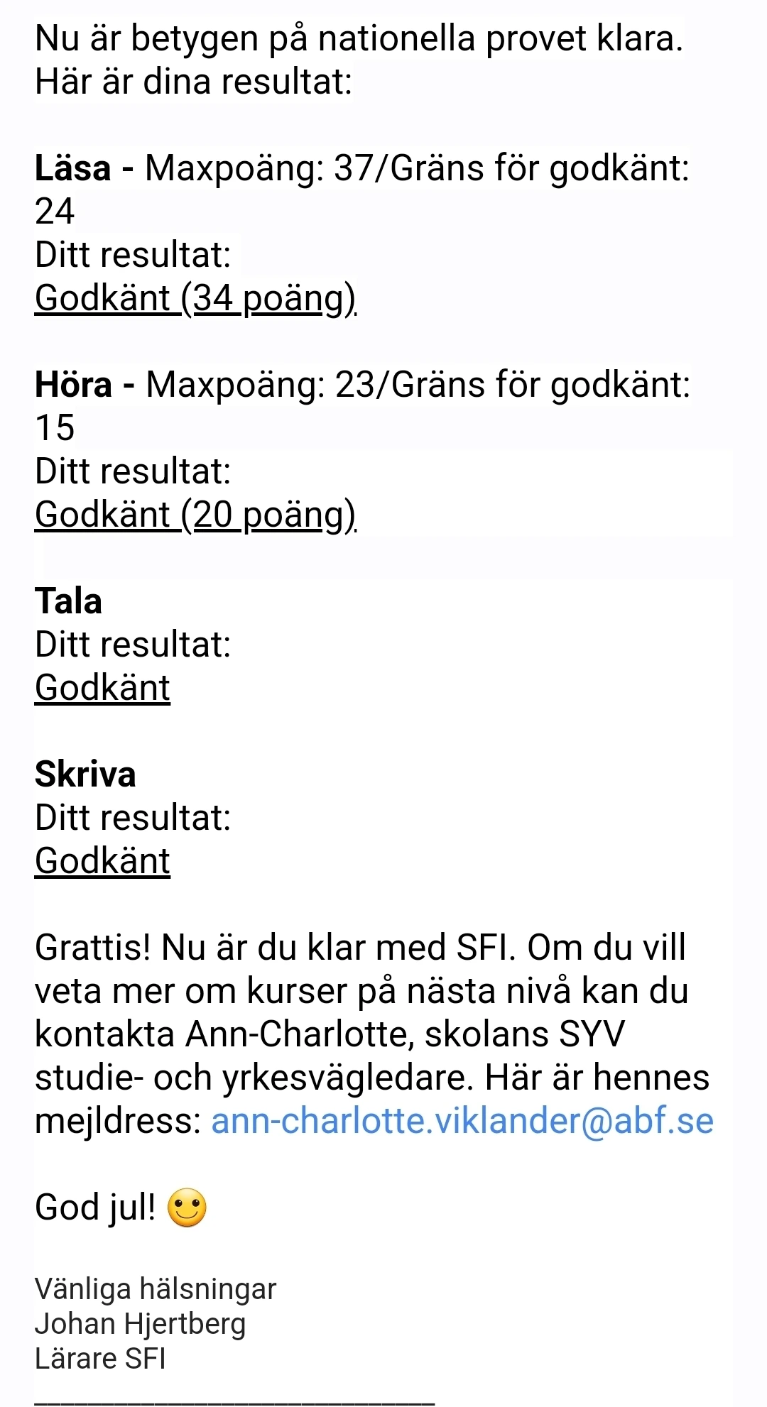 축하합니다! 이제 SFI가 끝났습니다. 다음 레벨의 과정에 대해 더 알고 싶으시면 학교의 SYV 연구 및 직업 지도 카운슬러인 Ann-Charlotte에게 연락하실 수 있습니다. 그녀의 이메일 주소는 다음과 같습니다. ann-charlotte.viklander@abf.se