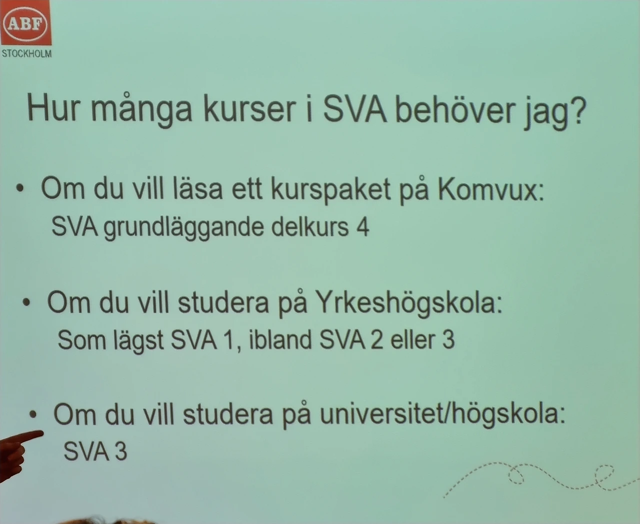 undersköterska(간호조무사?)를 제외한 직업협력과정(kurspaket)은 SVA grund를 졸업해야 갈 수 있다고 한다. 제빵등의 직업학교는 과정에 따라 SVA 1,2,3을 졸업해야 할 수 있단다. 그리고 3을 마치면 스웨덴어로 수업하는 대학교에 갈 수 있다.