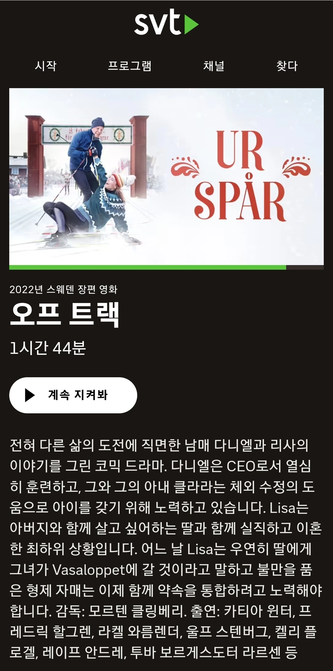 암튼 담주 월요일까지 해야 하는 여러 개의 숙제 중 하나가 ur spår라는 영화를 보는 것이다. 이 영화의 메인으로 다뤄지는 Vasaloppet는 5백 년 전 덴마크로부터 스웨덴을 독립시킨 vasa라는 왕의 이름을 따서 만든 컨츄리스키대회이다. 무려 90km을 스키를 타고 횡단하는 세계에서 가장 긴 스키경기라고 한다. 신기하게도 이 영화는 Svt라는 스웨덴 국영 방송국에서 만들었는지 방송국 홈페이지에 들어가면 무료로 볼 수 있다. 단, 자막이 스웨덴어만 가능하다.