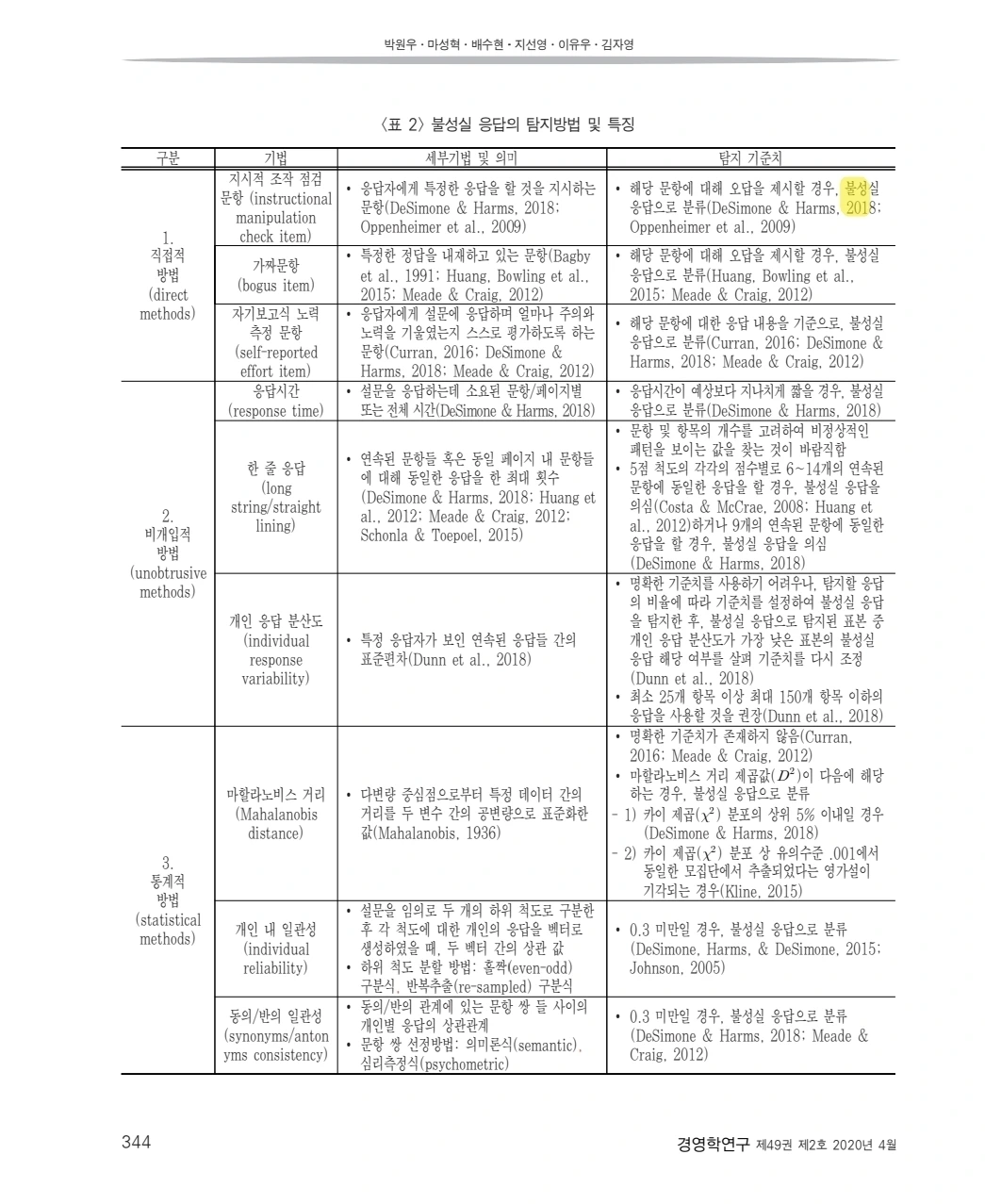이외에도 아래 표와 불성실 응답을 걸러내는 다양한 방법이 있습니다. 자세한 내용은 아래 논문을 참고해주세요. 정리가 체계적으로 잘 되어있더라고요.