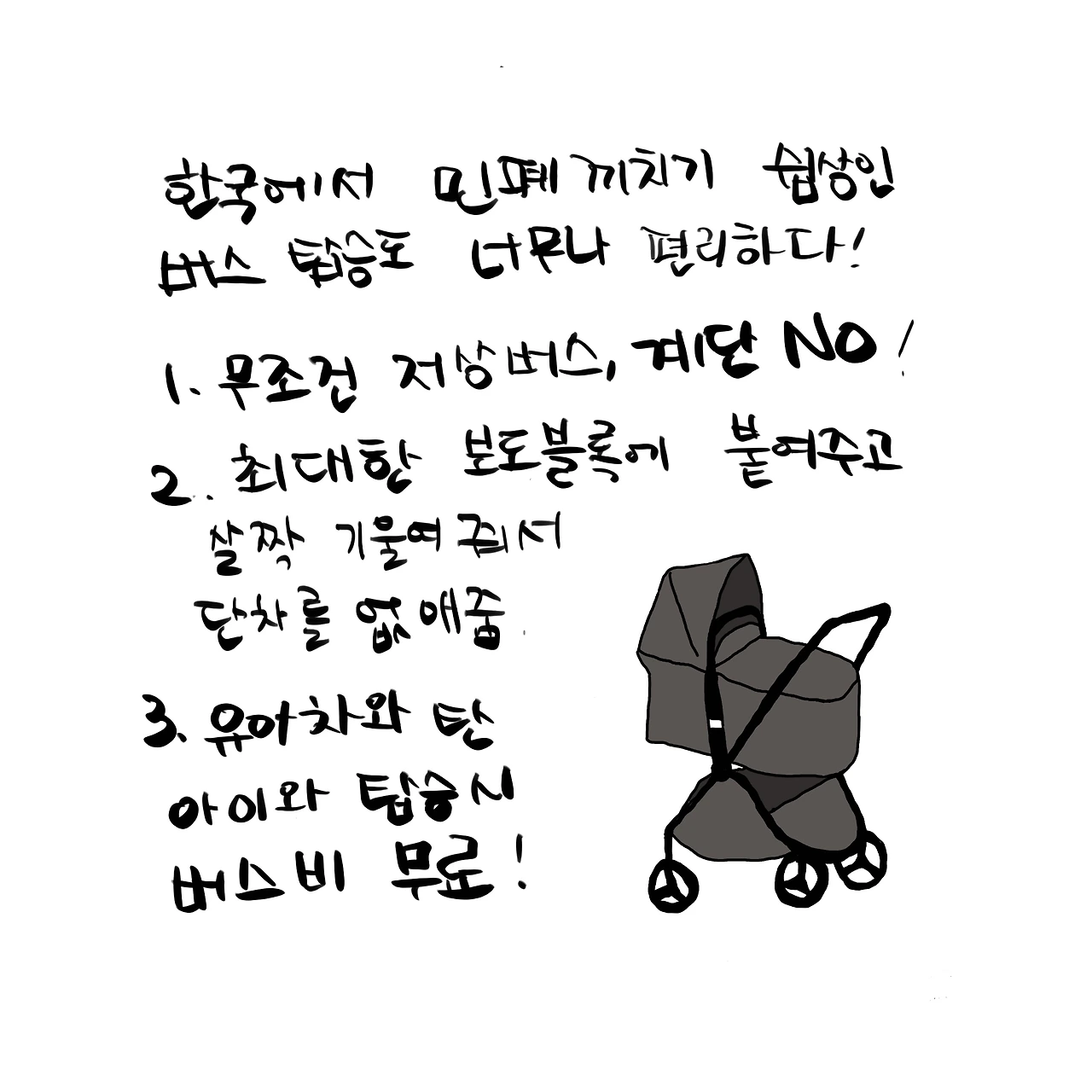 한국에서는 유모차 접어서 한 손에 들고 아이를 안고 버스를 타곤 했는데. 시간도 오래 걸리고 위험해서 종종 승차거부를 당하기도 했었죠. 그래서 아이 있으면 운전이 필수라고들 하잖아요