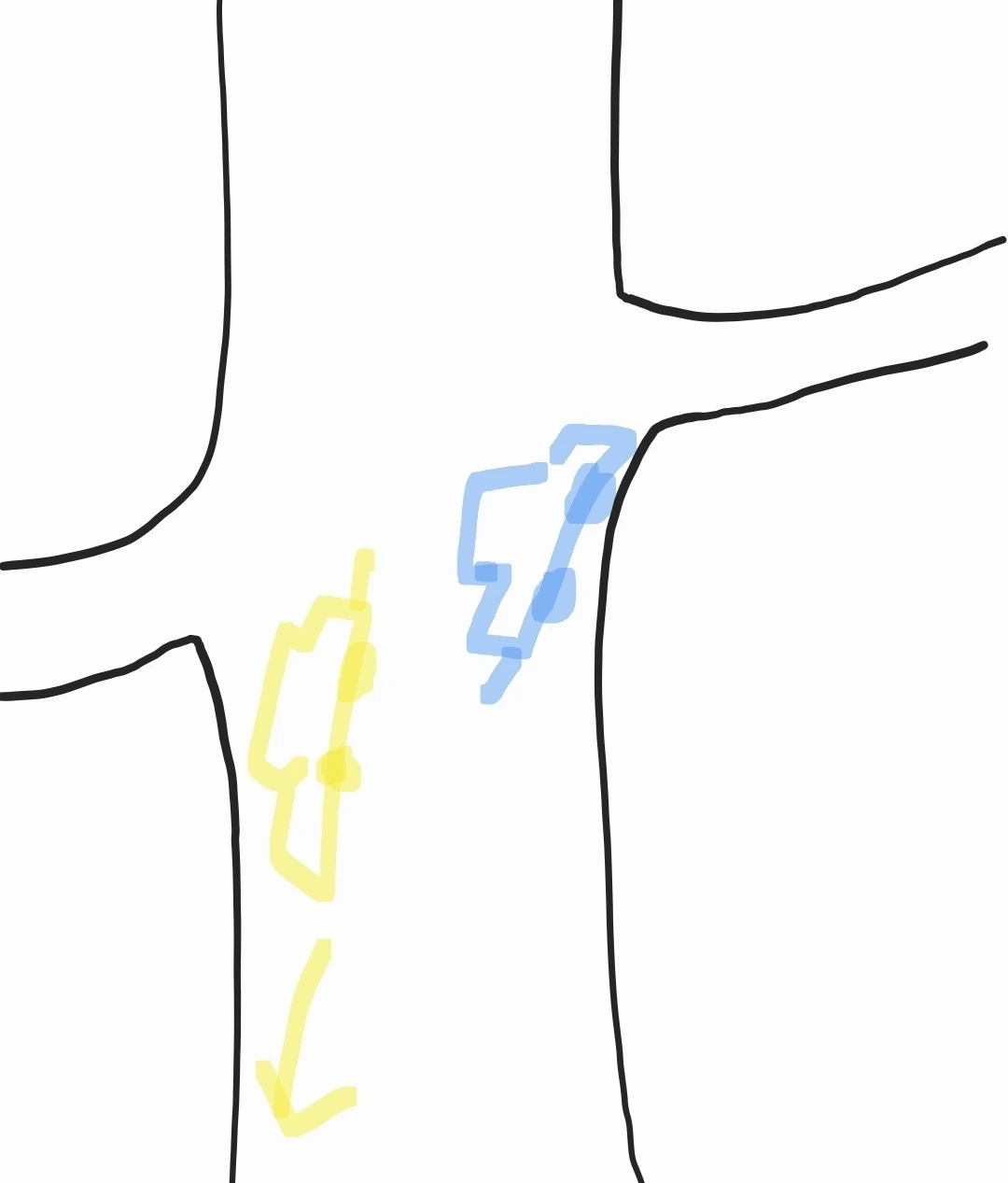 파란 차 위치에서 노란 차처럼 다시 돌아가려면 어떻게 해야 할까? 그냥 사실 유턴을 해버리면 될 거 같기도 한데 아마도 한 번에 유턴이 안 될만한 폭이었겠지라고 생각하고 답을 이야기했다.