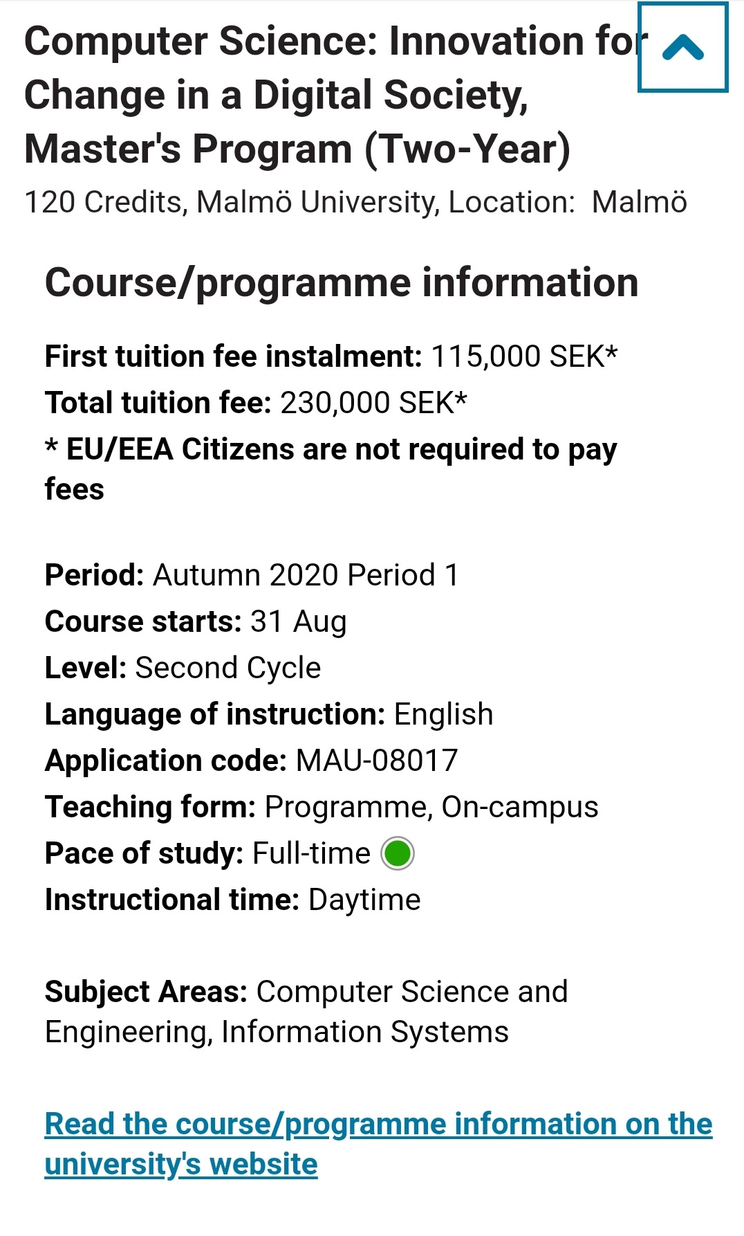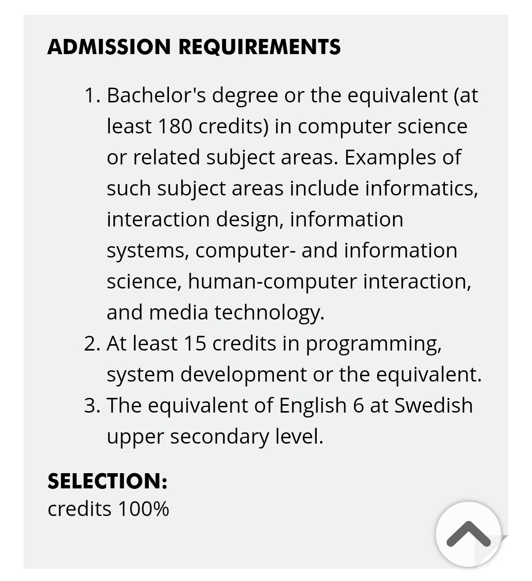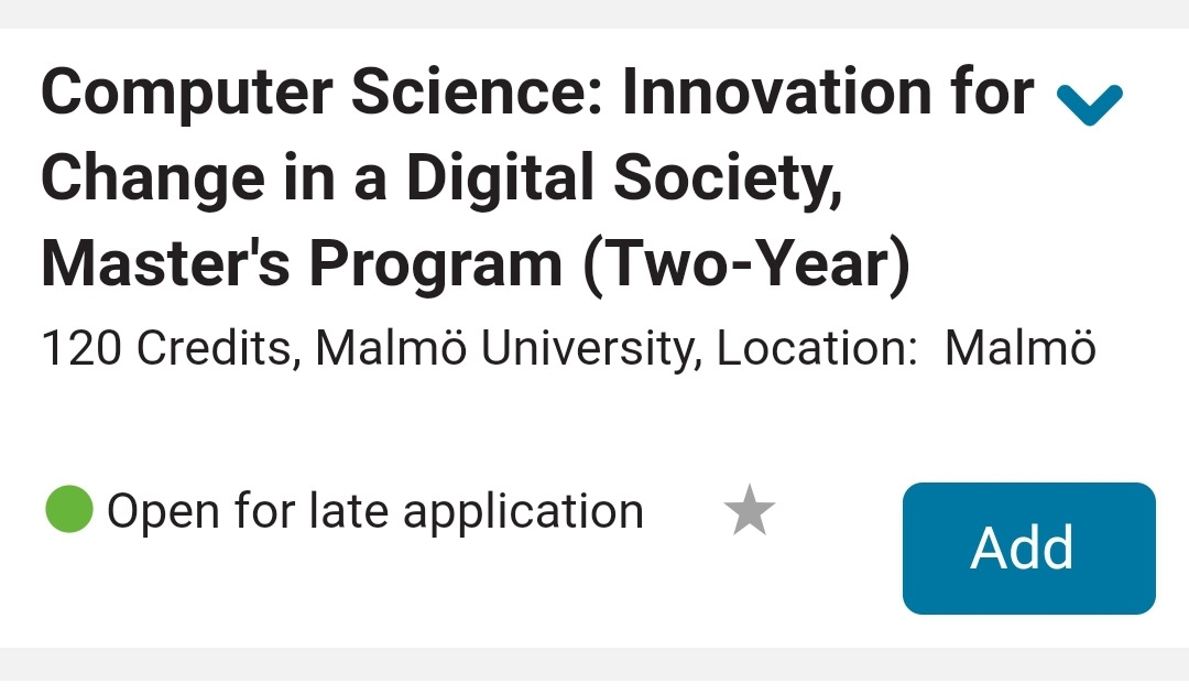 하기에 보이는 이번 가을학기 늦은 지원으로 열린 말뮈대학원의 컴퓨터공학 석사과정의 경우 컴퓨터 학사로 180 credit , 그중에서 프로그래밍에서 15 credit 이상 이수가 필요조건이다.
