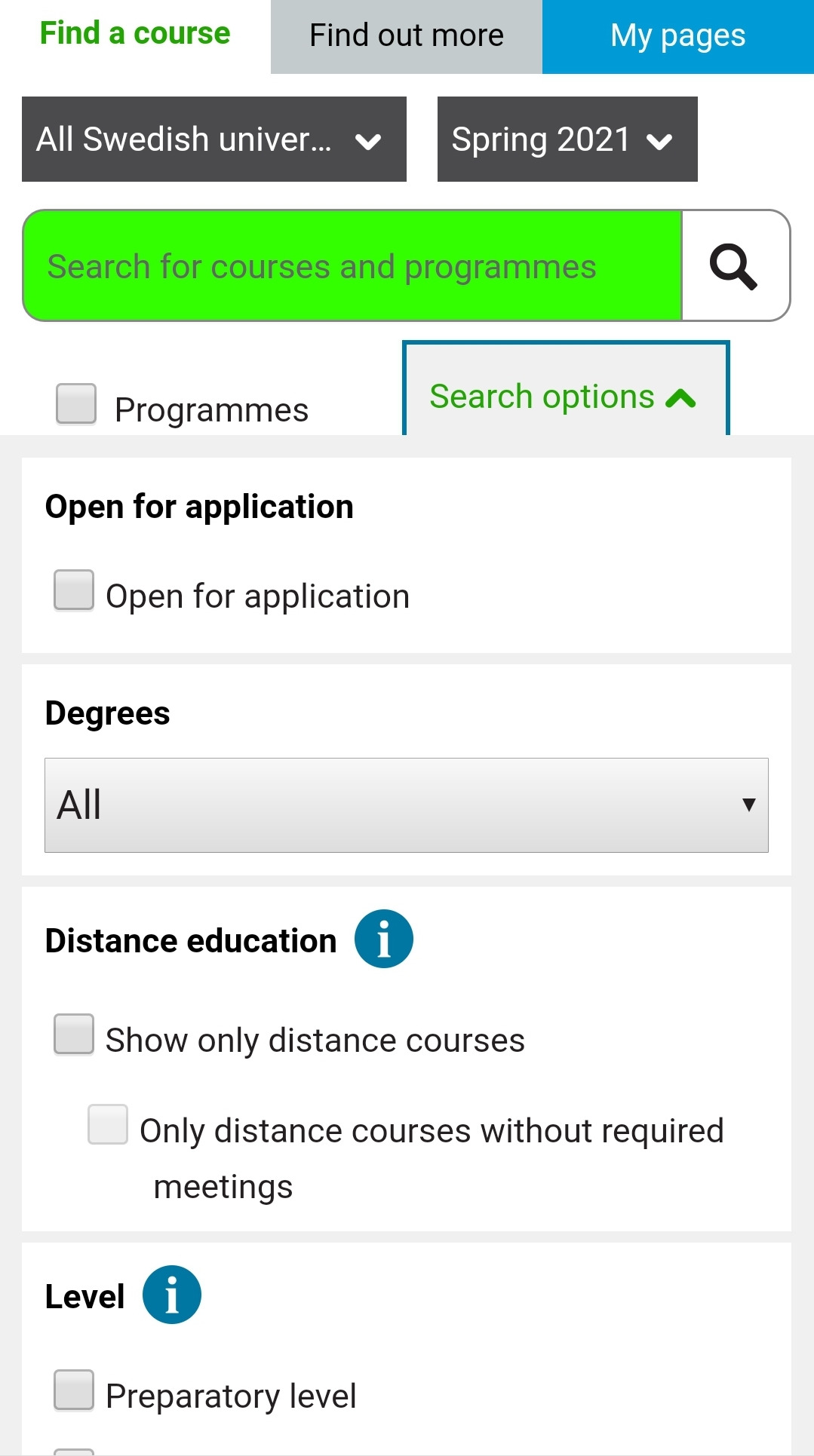 또한 Search option을 누르면 지금 지원 가능한지(open), 영어로 하는 수업인지, 학사인지 석사인지 등등을 고를 수 있다.