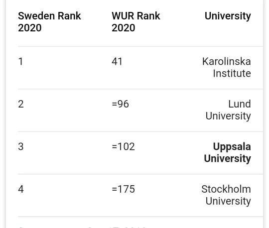 Google에서 검색해서 나오는 스웨덴 대학교 랭킹.WUR 기준으로 서울대는 64위, 성균관대가 89위 카이스트는 110위 순서이다.
