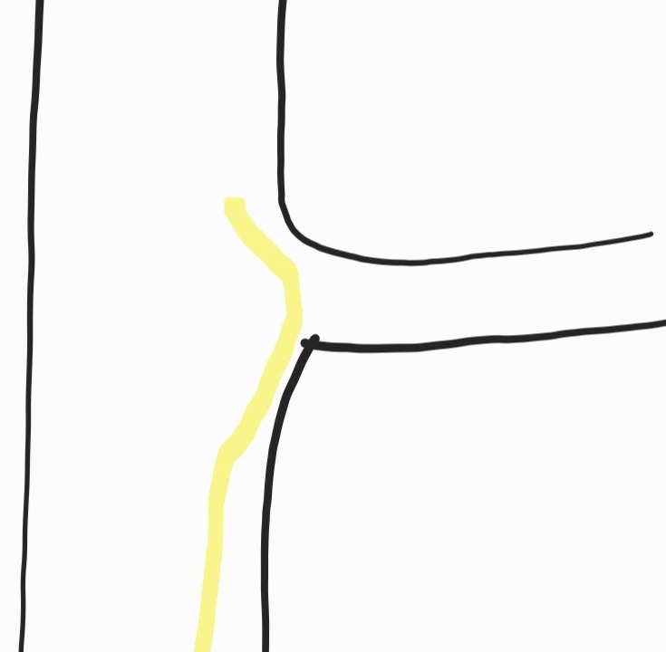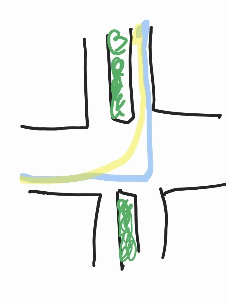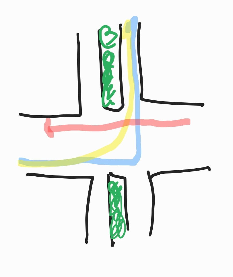아래 그림처럼 중앙선 대신 나무들이 심어져 있는 엘리에서 나는 습관적으로 노란선처럼 좌회전한다. 하지만 빨간 선처럼 마주 오는 차의 공간을 남겨놓기 위해 최대한 파란색처럼 돌아야 한다고 한다.