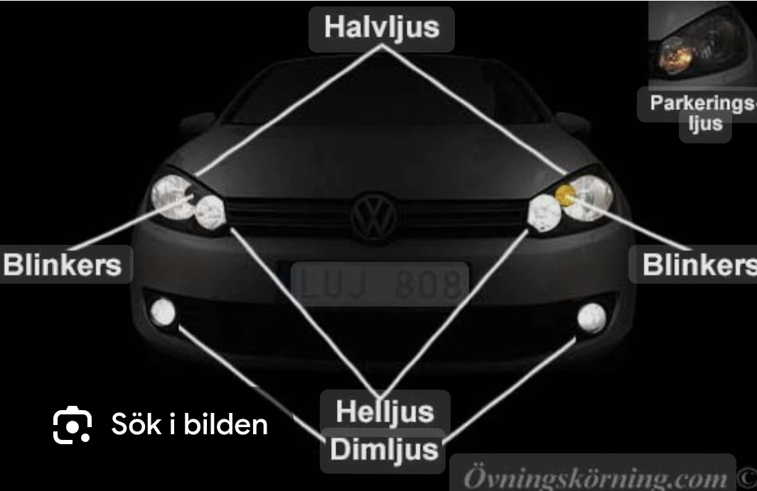 출발하기 전에 안전 체크를 하는데 등 종류가 막 헷갈리기 시작했다. 기본이 half beam(halv ljus)이고 Full beam 하라고 해서 하이빔 쏘듯 안으로 당겼는데, 그러면 반짝하고 만다고 밀란다. 그러고 나서 parking light를 켜라는 데 그게 뭐지 싶더라. 비상등을 켜라는 건가? 파킹라이트가 뭐였지? 근데 그 차는 왼쪽 빛모양+auto 써진 버튼을 누르면 half beam, parking light 등을 선택할 수 있었다. Parking light는 아주 약하게 나오는 앞에서 나오는 빛인데 이 차는 뒤에도 있지만 스웨덴 법 상으로 뒤쪽은 의무가 아니라고 한다. 심벌을 잘 봐두라고 했다.