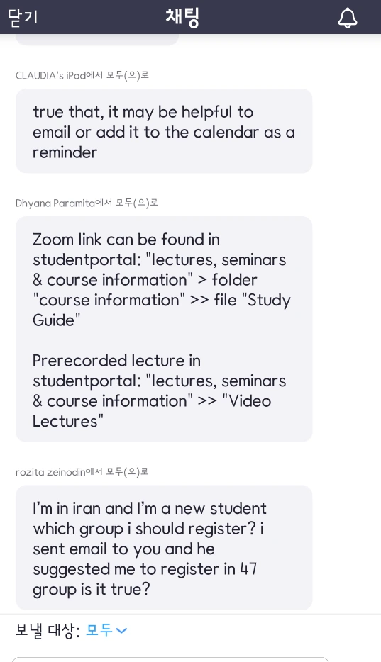 하지만 의미는 있었다. 그곳 채팅방에서 공유한 WhatsApp 수강생 모임 방을 통해 따로 두 명의 학생과 수업이 끝난 후 대화할 수 있었던 것. 한 명은 인도애인데 자기네 조모임 그룹에 자리가 생긴다며 들어오라는 메시지를 보냈고 또 한 명은 핀란드애인데 어제도 수업에서 너 이름 봤다며 말은 건 것이다.