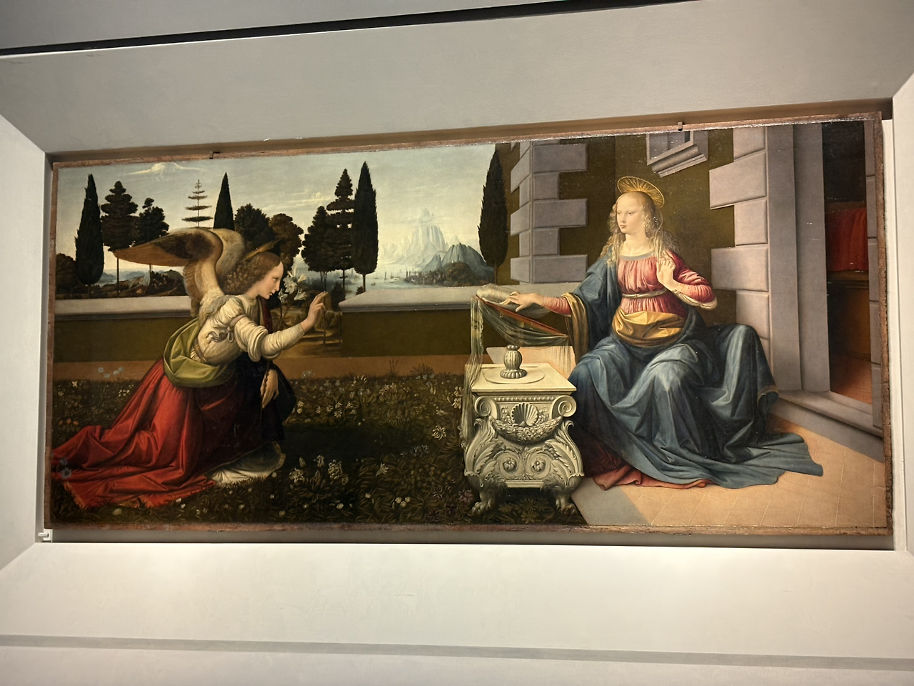 아래는 레오나르도 다빈치의 수태고지. 초기 작품 중 하나로, 천사가 성모 마리아에게 예수의 임신을 알리는 순간을 묘사한 그림이다. 원근법과 경계를 없애 자연스러운 색변화를 보여주는 스푸마토 기법이 잘 드러난 작품이라고 한다.