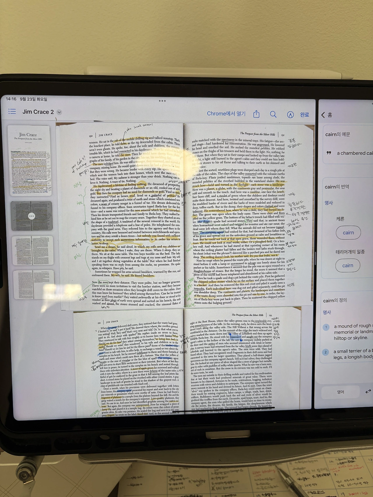 그렇게 해보니 새삼 영어 읽는 속도가 너무 느려서 너무 답답하다. 고작 7페이지짜리 단편소설. 처음에는 모르는 단어들에 밑줄만 치며 읽었다. 불면증에 걸려 현실과 백일몽이 섞여버린 주인공의 이야기였는데, 그걸 읽는데 나도 현실과 꿈속에서 길을 잃어버린 주인공처럼 내용을 마구 헤매고 있었다. 그렇게만 읽는데도 몇 시간에 걸렸고 내용은 희미했다. 다시 처음으로 돌아가 하나하나 단어를 찾으며 읽는데도 내용이 잘 이해되지 않았다. 결국 번역기를 켜서 책을 찍었다. 갑자기 모든 내용이 선명하게 이해된다.