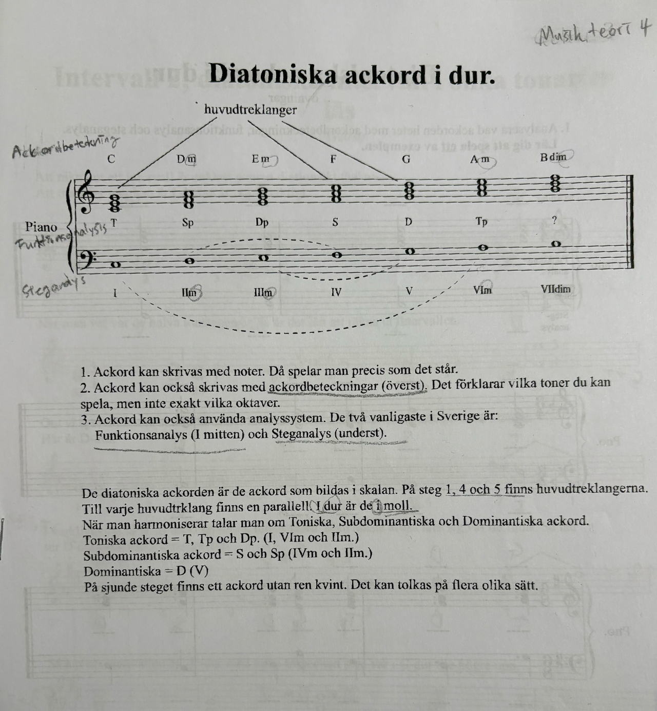 여기서 다장조 음계 내에서 같은 화음들을 부르는 세 가지 방법이 적혀있다. 맨 위에 C, Dm 같은 코드 이름이 있고, 중간에는 이 음계 내에서 각 화음이 어떤 역할을 하는지 알려주는 기능적 표시가 있다. 그 아래에는 로마자로 1, 2, 3을 표시한 로마자 표기가 있다.