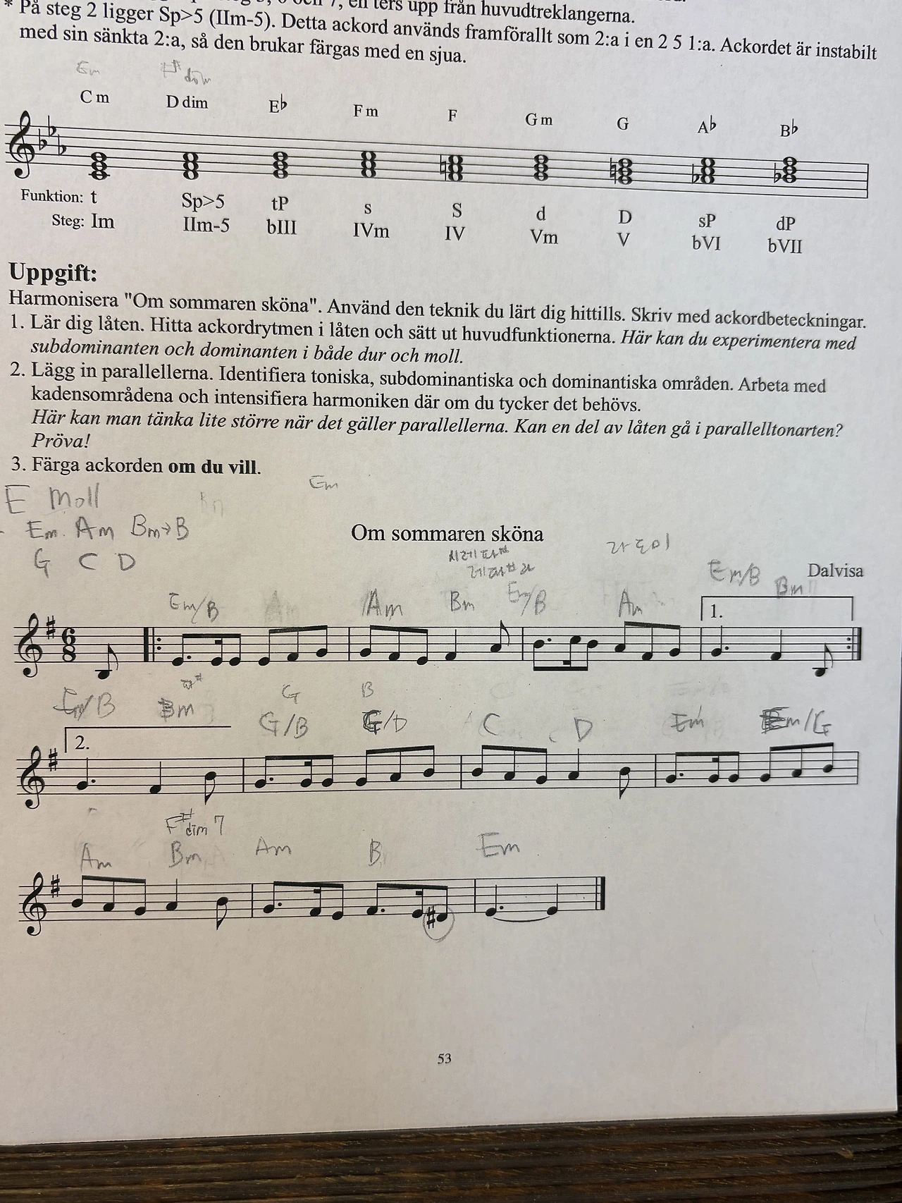 성실 그 자체인 아스트리드가 감기로 연습과 수업 모두 못 오게 되면서 수요일 연습은 카린과 나 둘이서 하게 되었다. 화음을 만드는 게 참 신기한 게 멜로디에 있는 음은 같은데도 어떤 음이나 분위기를 입히고 싶은지에 따라 천차만별이다. 그리고 흐름이라는 게 있어서 다른 사람이 만든 것 중에 이 마디에 이 코드가 괜찮은데 하고 그 부분만 가져오면 그 느낌이 안 나고 동동 뜬다. 그래서 각자 만들어온 코드를 합치는 게 생각보다 쉽지는 않다.