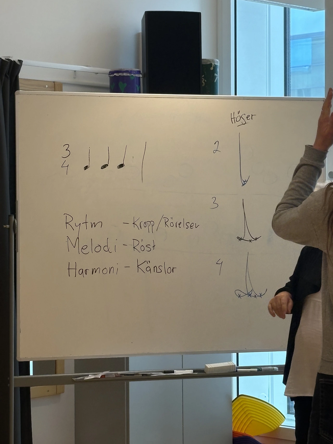 그리고 두 번째 수업은 리듬연습이었다. 기존에 배웠던 것들에 조금씩 더하며 지난 중에 학생들끼리 연습한 것도 확인했다. 이번에 새로 배운 건 2/4박자 3/4박자 4/4박자 지휘 방법. 초등학교 음악시간에 다 배운 거지만 여긴 아닌지 해본 적 있느냐로 추정되는 선생님의 질문에 아니라고 답하더라. 그리고 전 시간에 잠깐 했던 화음을 더 배웠다. 만국 공통인 멜로디나 리듬과 달리 화음음 문화권마다 크게 차이가 있단다. 그래서 화음의 구성이나 느낌 같은 건 학습으로 익혀야 하는 부분이 있다는 것. 그래서 1도, 4도, 5도 화음에 맞춰 자신이 생각하는 각 화음에 맞는 동작을 해보기도 하고 느낌을 설명해 보는 시간을 가졌다. 예를 들면 1도(도미솔) 기본, 안정 같은 느낌이라면 5도(솔시레)는 정상이나 꽃 피는 것처럼 느껴진다는 식.
