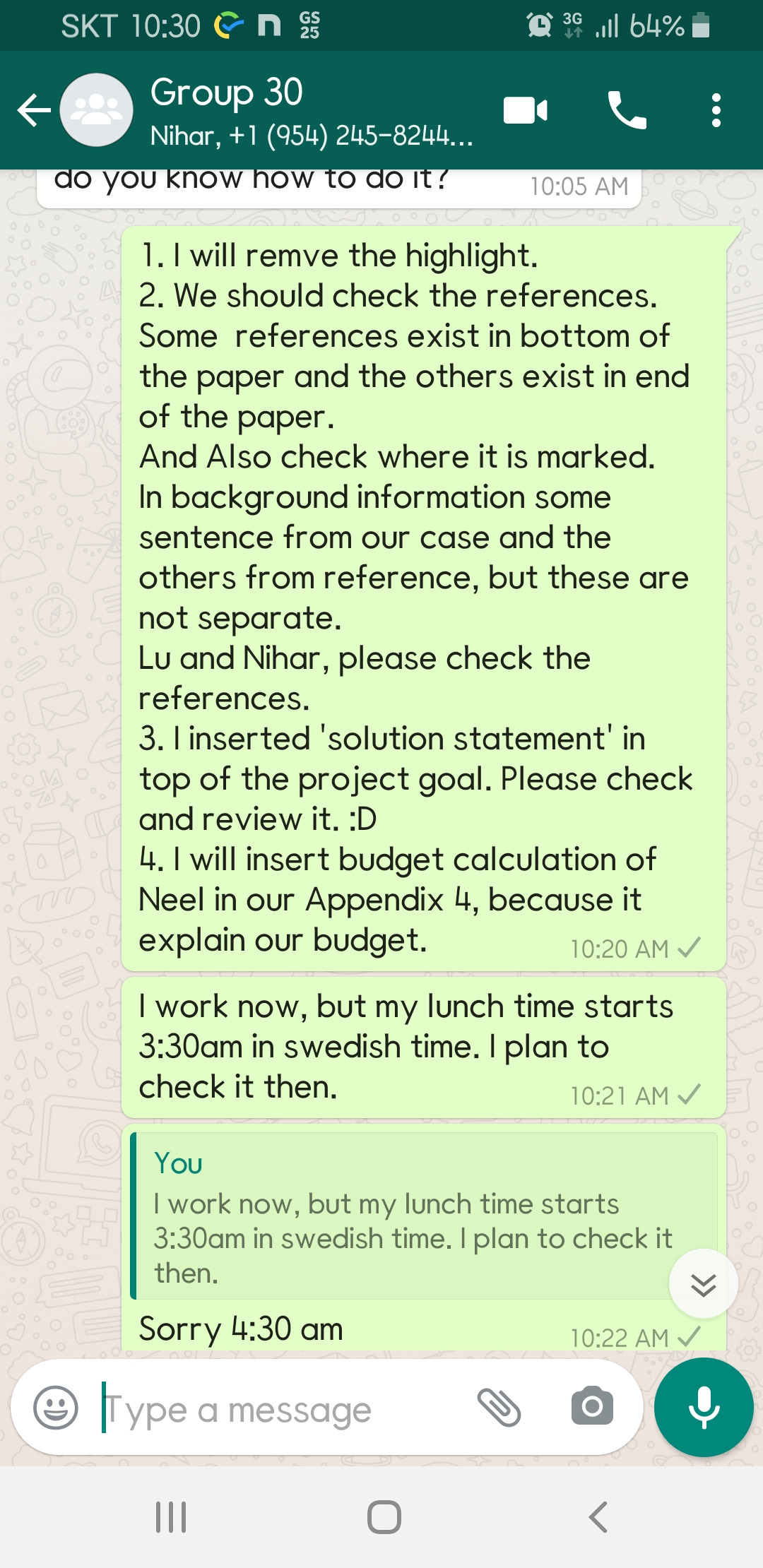 일요일 저녁 8시. 미국에 있는 클라우디아가 일어남과 동시에 '프로젝트 경영수업' 첫 번째 과제 제출 전 마지막 조모임이 시작되었다. 토요일 조모임 이후에 나눈 부분들을 각자 해서 넣었고 그걸 바탕으로 내용을 공유하며 고쳐나갔다. 쉬는 시간 없이 무려 4시간이 지나고, 한국시간 12시가 넘었다. 나는 내일을 위해 자러 갈 시간이 되었다며, 일어나서 볼 테니 계속 과제를 고치고 알려달라고 했다.