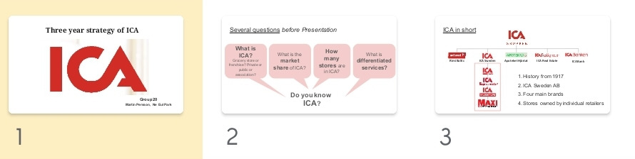 주말 동안에 영혼을 쏟아부어서 ICA와 경쟁사에 홈페이지를 나노 단위로 쪼개 본 덕분에 나름 풍성한 내용으로 월요일 리포트를 제출했다. 발표는 수요일, 주어진 시간은 15분. 어제는 열심히 프레젠테이션을 만들었다.
