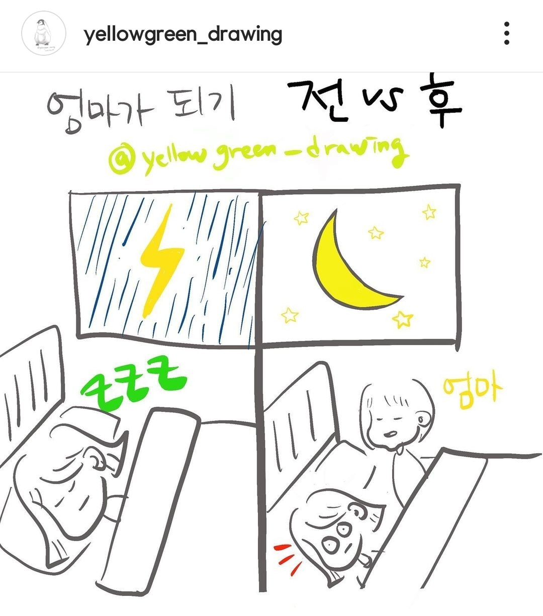 그런데 엄마가 되고 나니, 신기하게도 아이의 '잉~' 소리 한번에 눈이 번쩍 떠지더라고요. 만약 그게 쉬가 마려워서 우는거라면, 벌떡! 일어나서 아이를 들고 화장실에 데려갈 수도 있게 되었어요. (첫째가 기저귀 떼고 꽤 오래 밤에 실수를 했거든요.왜 울지하고 멍하니 있다가 참지 못하고 싸서 매트리스에 대참사가 벌어진 적이 한두번이 아니기 때문에, 늘 10분 대기조처럼 기다렸지요.)