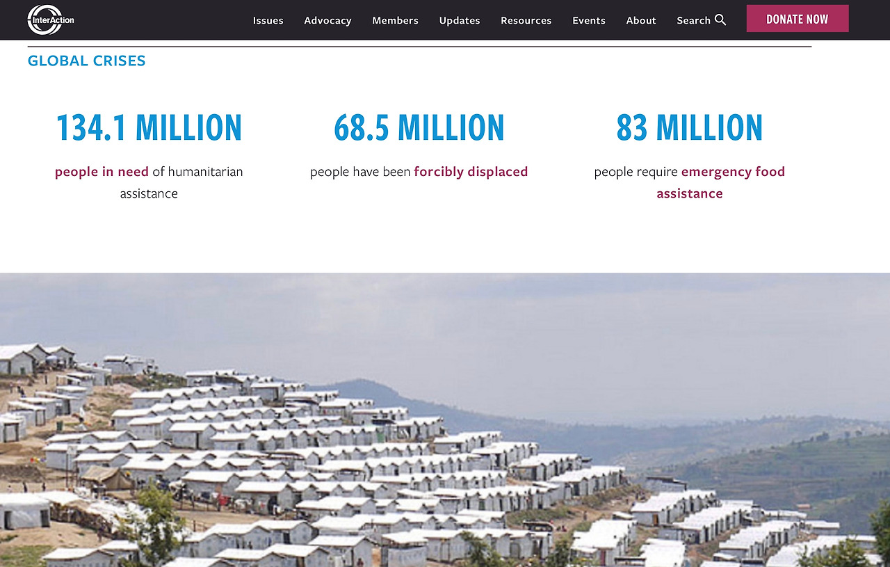 미국의 NGO단체 협회인 Interaction에 의하면, 1억 3천 5백만명 가까이 되는 사람들이 인도주의적 도움을 필요로 하고 있다고 한다. 대한민국 인구의 두 배가 넘는 사람들이 위기 속에 고통받고 있는 것이다. 그 중 약 절반에 가까운 사람들이 자신이 살던 지역에서 강제로 쫓겨난 사람들이며, 약 8천 3백만명의 사람들이 당장 먹을 것이 없어 굶주리고 있다고 한다.