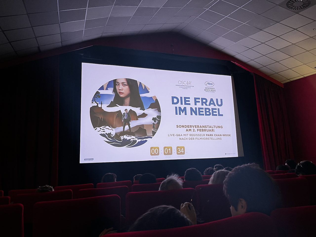 ‘헤어질 결심‘의 독일 개봉 시간은 2023년 2월 2일 독일 시간 19시 15분이었다(함부르크 기준). 다른 도시에서는 19시에 개봉한 곳도 있다고 했다. 영화 제목은 독일어로 조금 다르게 번역되었는데 ‘Die Frau im Nebel’, 즉, ’안개 속의 여인‘으로 번역되었다. 예매를 하면서 조금 특이했던 건 좌석예약을 받지 않았다는 것이었다. 다른 시간대 영화는 모두 좌석 예약이 가능한데 왜 굳이 GV가 있는 타임만 자유 좌석 선택제를 선택했는지는 모르겠다. 이렇게 되면 좋은 자리를 잡기 위해 일찍 가야할 것 같긴 한데 얼마나 일찍 출발해야 할지 애매했다. 박찬욱 감독이 유럽에서 유명하다고는 하지만, 과연 얼만큼의 사람들이 올지, 얼만큼 열정적으로(?) 일찍 올지 알 길이 없었기 때문이다. 일단 한 시간 정도 일찍 도착했다. 처음 도착했을 때는 사람이 별로 많지 않았지만, 영화 시작 30분전 쯤 되자 사람들이 몰려왔다. 우루루 몰리는 정도는 아니었지만, 차곡차곡 사람들이 들어서는가 싶더니 어느 순간 90% 이상 자리가 꽉 찼다. 우리나라 기준 보통 크기의 영화관이었다. 혹시나 한국 사람만 오는 건 아닐까도 생각했지만, 체감 상 관객들의 70% 이상은 비한국인이었다. 최소한 함부르크에서는 생각보다 많은 현지 사람들이 박찬욱 감독의 새 영화, 그리고 감독과의 GV에 관심을 가지고 있구나 느낄 수 있는 순간이었다.