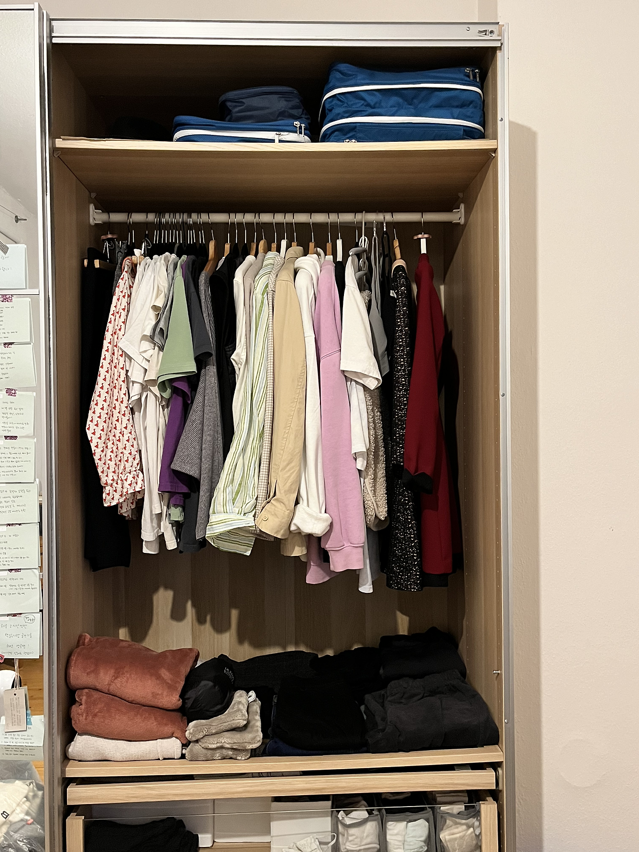 그렇게 남긴 옷들을 사진으로 남겼다. 사진에 나온 옷들 말고도 오른쪽에 있는 옆칸과 복도의 외투 옷장에 걸린 옷들이 더 있긴 하다. 옆칸에는 후드집업이나, 샤워 가운, 길이가 좀 더 긴 점프수트 등이 사진보다는 좀 더 적게 2/3 정도 걸려있다. 복도에 있는 외투 전용 옷장에는 패딩 1, 겨울 코트 2(다른 디자인), 초겨울 외투 1, 가을 코드/재킷 2 등이 더 있다. 사진 아래의 서랍에는 세탁이 완료된 바지류가 5-6개 정도? 있는 것 같다. 누군가가 보기엔 여전히 많을 수도 있겠지만, 7년 전까지 맥시멀리즘으로 살던 예전의 내 옷장에 비하면 정말 정말 많이 간소화가 되었다.
