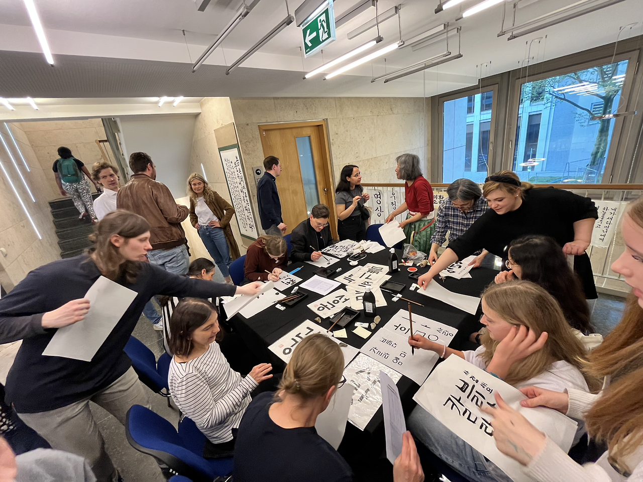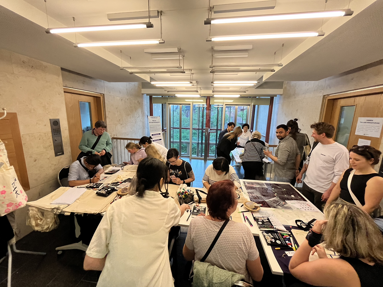 먹거리 외에도 이벤트가 제법 풍성했다. 서예 체험, 한복 체험, 한글 에코백 제작 체험, 책갈피에 내 이름 한국어로 써보기 체험 등이 준비되어 있었다. 이런 체험은 모두 무료였고, 한글과 관련된 체험은 함부르크 한인학교에 근무하는 선생님들께서 수고해 주셨다. 체험 코너에는 현지인이나 외국인들이 꽤 많았다. 나는 에코백 코너에 앉아서 한글로 나만의 에코백을 만들었다. 자리에는 한글을 잘 모르는 외국인들을 위해서 한글을 예쁘게 쓸 수 있게 가이드 안내판 같은 것들도 잘 준비되어 있었다. 처음에는 그저 한 번도 안 가본 행사라 한 번쯤 경험해 봐야 나중에 주위 친구들에게도 소개해줄 수 있을 것 같아 호기심에 왔는데 어느새 나도 모르게 빠져들었다. 에코백에 이렇게 쉽게 한글로 나만의 가방을 만들 수 있다는 사실도 새로웠고, 오랜만에 서예를 해본 지인은 옛날 생각이 난다며 좋아했다. 내년에는 다른 나라의 영사관도 방문해서 다양한 문화를 체험해 보고 싶다.