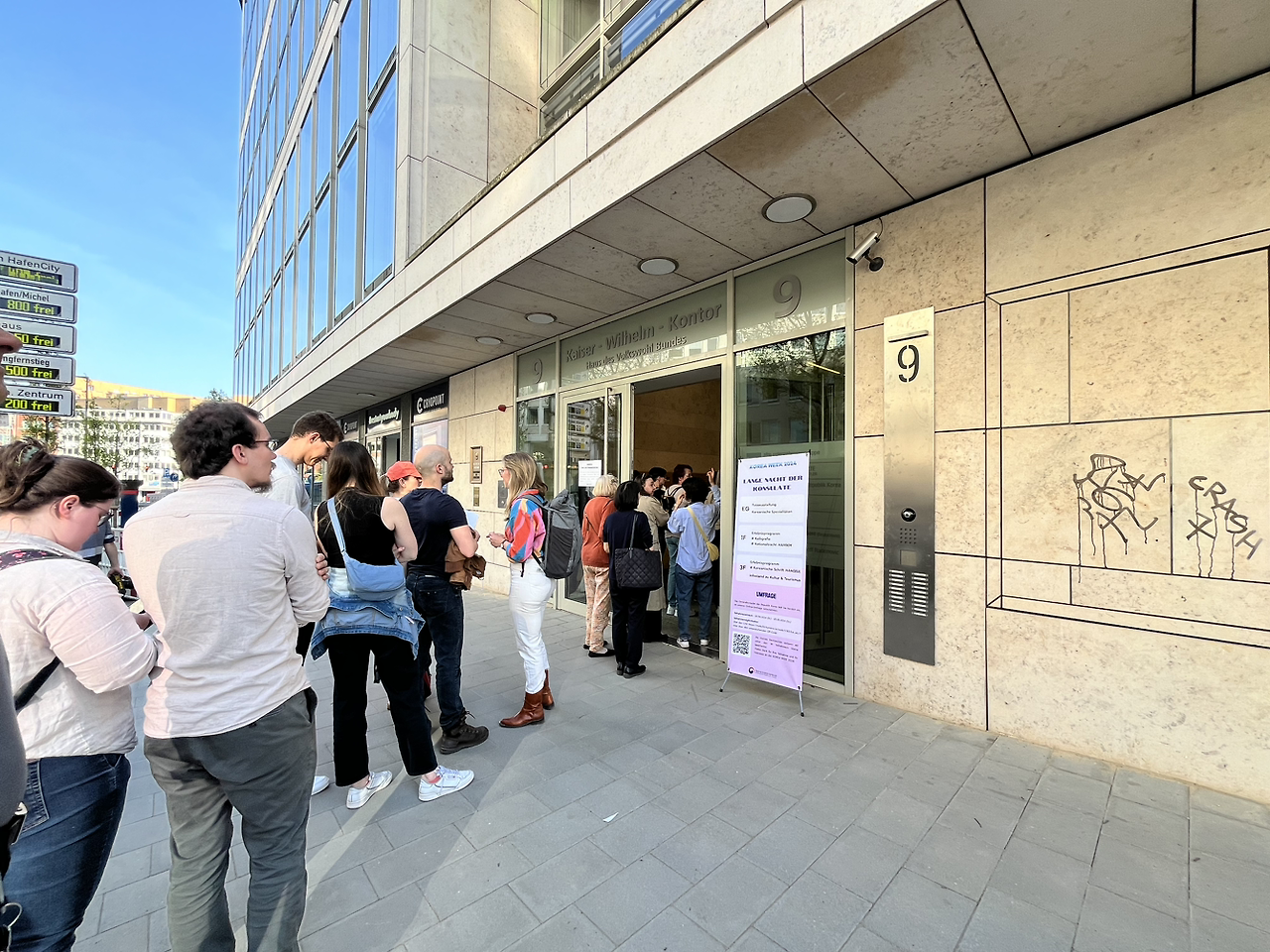 매년 이맘때쯤이면 ‘영사관의 긴긴밤 (Lange Nacht der Konsulate)’라는 행사가 열린다. 올해는 4월 말부터 5월 첫째 주 사이에 열렸다. 한국 영사관뿐만 아니라 중국, 이탈리아, 아르헨티나, 에티오피아, 칠레, 프랑스, 인도 등 다양한 나라의 영사관에서 같은 기간에 열린다. 올해는 총 21개 영사관이 참여했다. 이름처럼 저녁부터 시작해서 아홉 시나 열 시 늦은 밤까지 다양한 행사를 준비하고 모두에게 문을 여는 행사이다. 각자 나라의 문화를 알리고 서로 교류할 수 있는 문화 교류의 장이라고 볼 수 있다. 이런 좋은 행사를 지금까지 왜 모르고 살았는지 의문이지만, 어쨌든 첫 번째 참가이니까 의리를 지키고자 한국 영사관을 찾았다. 무료로 열리는 K-pop 댄스 일일 수업은 이미 예약이 꽉 차서 대기 명단에 이름을 올려놨음에도 아무도 취소하지 않아 구경도 못했다. 그래서 오픈 행사에만 가보기로 했다. 도착하자마자 긴 줄이 늘어서 있어 살펴보니 한국 음식을 사 먹기 위한 줄이었다.