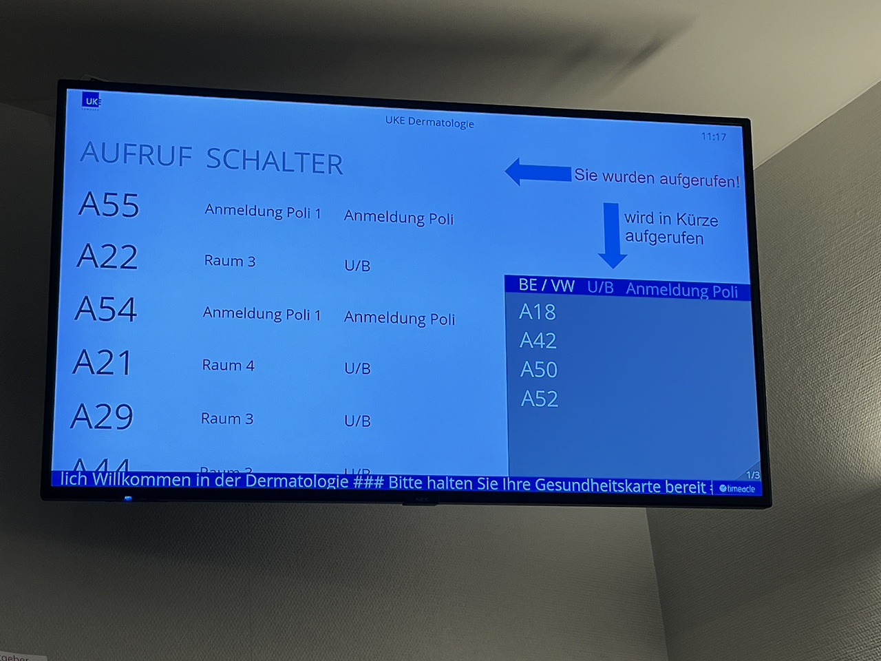 처음 가보는 대학병원이라 더 긴장도 되고 스트레스가 컸던 것 같다. 행여나 늦으면 예약이 취소될지 모른다는 걱정에 걸어가야 하는 구간도 공용 자전거를 빌려 타고 열심히 달렸다. 결국 4분을 늦었다. 대학병원이니 부지가 클 거라고는 예상했지만 역시나 크고 넓었다. 그래도 안내판이 이해하기 어렵진 않아서 피부과의 위치는 금방 찾았다. 이만한 상황에 4분 늦은 거면 선방했다 생각하며 접수처로 갔다. 접수를 하러 왔다고 했더니 앞에 있는 대기표를 뽑으라고 했다. 접수실 앞에 독일어로 안내가 적혀있었는데 늦어서 급한 마음에 읽지 않고 지나쳐 버렸다. 번호표를 뽑는 기계는 커다란 터치형 모니터였다. 적어도 23인치는 돼 보이는 큰 화면인데도 버튼 모양도 없고 그냥 ‘예약한 환자’, ‘예약 안 한 환자’ 이렇게 글자만 적혀 있었다. ‘예약한 환자’ 쪽을 살짝 눌러봤는데 반응이 없어서 간호사에게 다시 물었다.