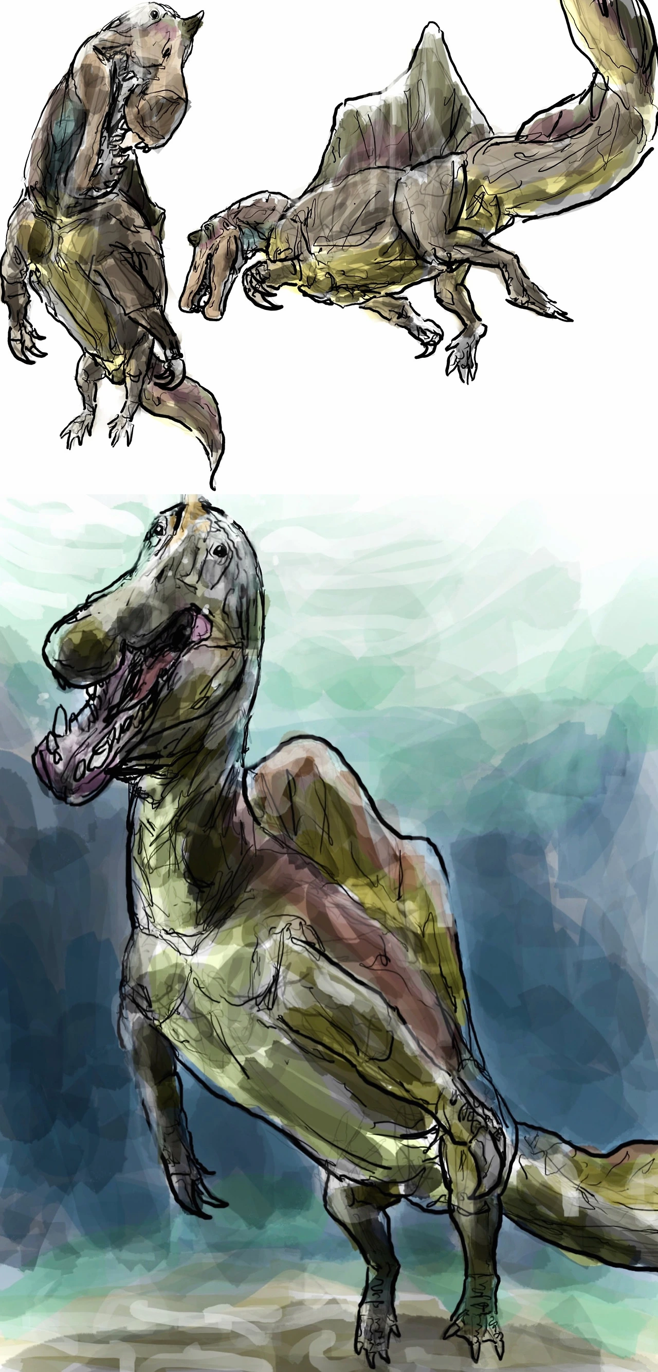 이번에 후쿠이 현립 공룡 박물관에서 개관 25주년을 기념해 특별전을 열었습니다. SNS에 올라온 일본 현지인의 스피노사우루스 골격 사진이 인상 깊어서 이를 그리게 되었고요.