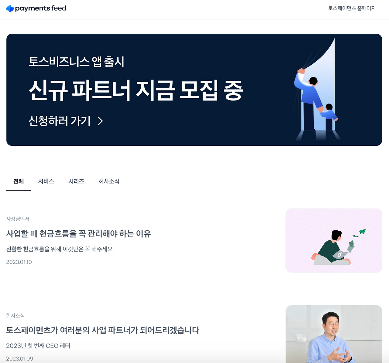 토스페이먼츠는 데카콘 핀테크 스타트업 토스가 LG 유플러스의 전자결제사업본부를 인수해 탄생한 토스의 계열사이다. LG유플러스의 전자결제사업본부에서 넘어온 PG업을 중심으로, 온라인에서 결제를 일으키는 사업자들에게 다양한 서비스를 제공하는 B2B기업이다. 공 매니저는 회사의 타깃인 온라인 사업자들에게 정확하고 신뢰 가는 정보를 전달하는 것을 목표로 토스페이먼츠피드를 기획, 운영하고 있다. 이 브랜드의 첫 번째 콘텐츠 매니저로서 콘텐츠 전략을 만들고 목표를 세우는 일부터 했다.