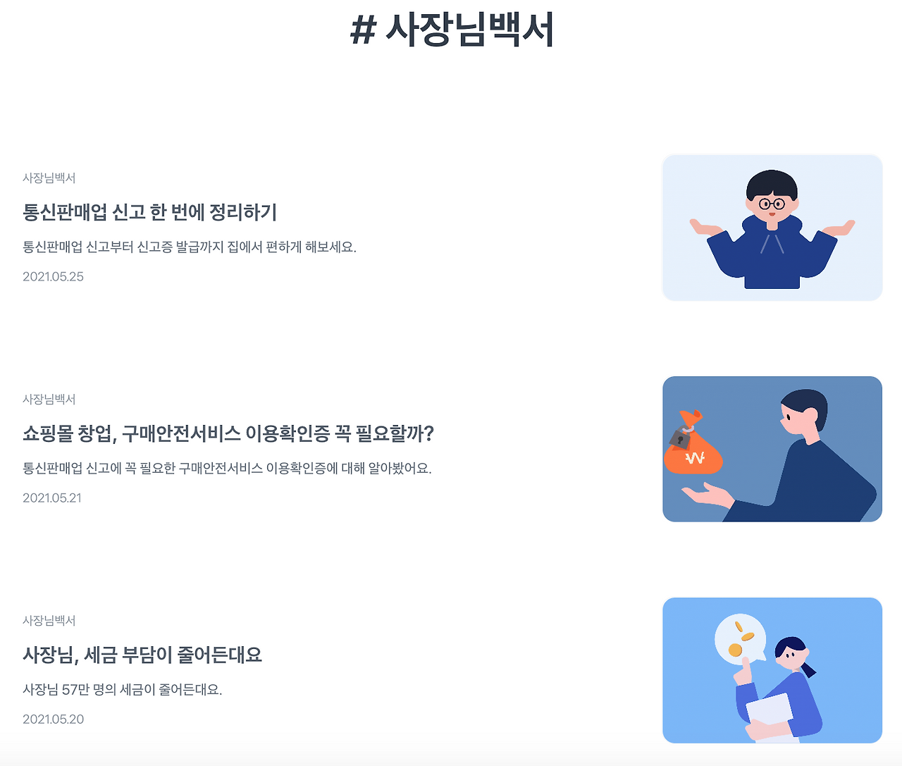 그렇게 탄생한 게 ‘사장님 백서’ 시리즈다. 이 시리즈는 중소규모 온라인 쇼핑몰 창업자들이 궁금해 할 내용을 꼼꼼하게 다룬다. 사업자등록, 통신판매업 신고, 호스팅사 및 PG사 선정 같은 초보 사업자의 창업 단계별 고민과, 세무, 노무 등의 전문적인 고민 등 창업자들이 필수적으로 검색하는 키워드를 타깃해 주제를 선정했다. 그리고 해당 주제에 대한 정확한 정보를 전달해 신뢰를 높이고자 했다.