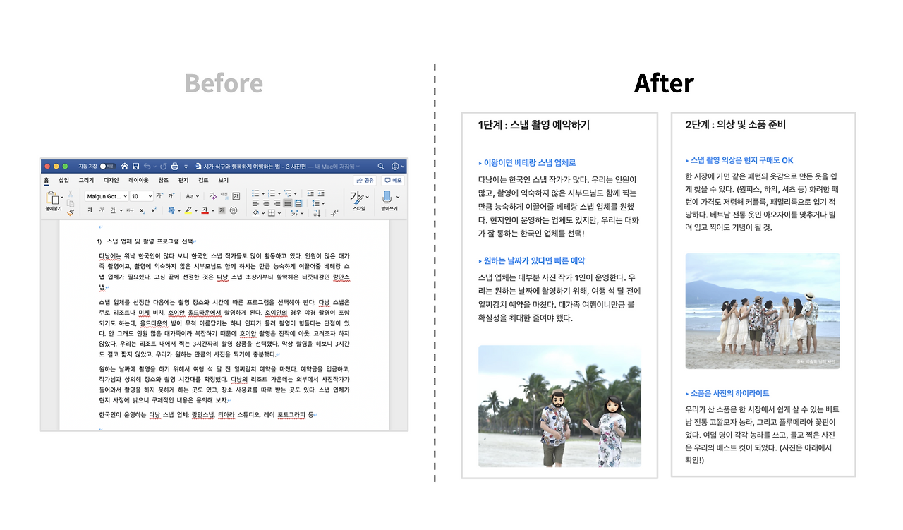 이거는 그다음 회사였던 여행 앱 ‘트리플’ 사례로 말씀드릴게요. 트리플에서 하던 일 중에 여행 작가들이 보내주는 원고를 편집하는 일도 있었는데요. 작가들의 원고 분량이 한글 파일로 3-4장 정도였는데, 이걸 모바일에서 스크롤 세 번 정도 하는 분량으로 편집했어요. 이렇게 하려면 긴 글에서 무엇이 핵심인지를 빠르게 찾아낼 필요가 있어요. 토스 UX라이터에 지원할 때 이렇게 편집한 것을 비포, 애프터 화면으로 캡처해서 포트폴리오에 넣었어요.