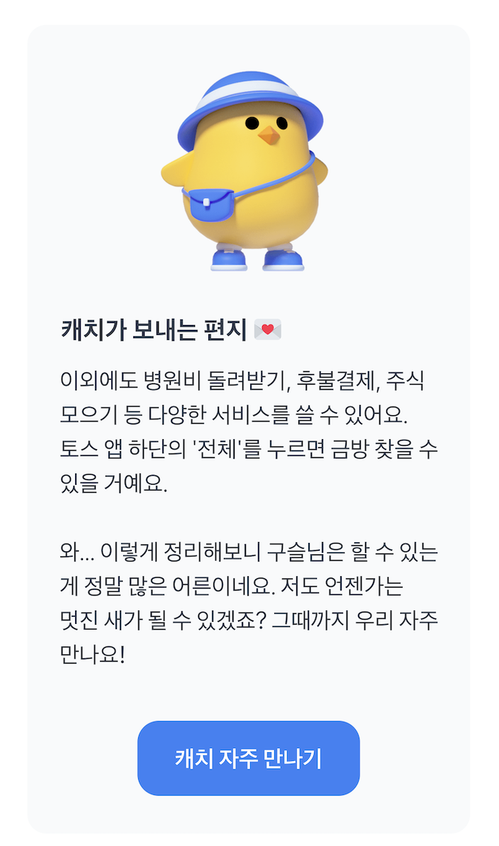 저 스스로도 좋아하고, 지금도 사람들이 가장 좋아해 주는 문장이 있어요. “수수료는 토스가 냈어요!”인데요. 지금도 토스에서 송금할 때 버튼 위에 조그맣게 쓰여 있답니다. 또 청소년 대상으로 쓴 것도 반응이 좋았어요. 청소년이 이용하는 토스 화면은 성인이 이용하는 것과 달라요. 청소년이 이용할 수 있는 금융 상품이 다르니까요. 이들이 성인이 되면, 토스 화면이 갑자기 바뀌어요. 이걸 어떻게 잘 전달할 수 있을지 고민하다가, 성인이 되면 쓸 수 있는 서비스를 추천해 주는 콘텐츠를 만들었는데요. 맨 마지막에 딱 한마디만 덧붙였거든요. “와, 구슬님은 이제 할 수 있는 게 정말 많은 어른이네요!”라고요. 같이 일하는 사람들이 많이 좋아해 줬어요.