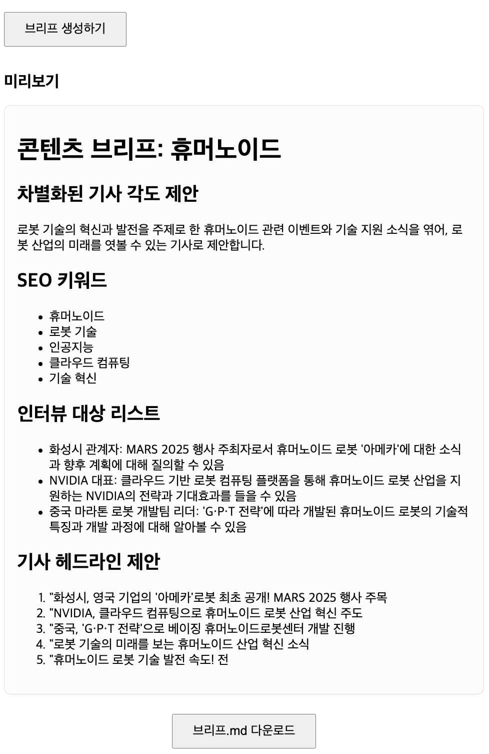 콘텐츠 브리프 제너레이터는 키워드를 넣으면 기사를 읽어와 차별화된 기사 각도, seo 키워드, 기사 헤드라인을 제안해주는 것입니다. 글을 기획하고 자료 조사하는 시간을 줄여주는 것을 타깃으로 하고 있습니다.